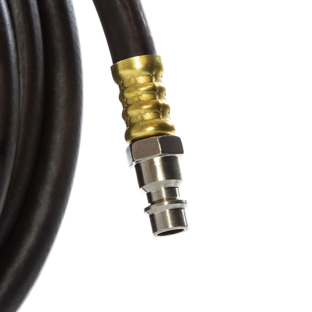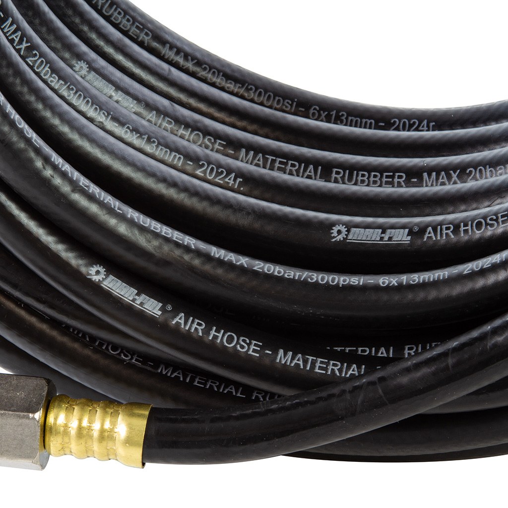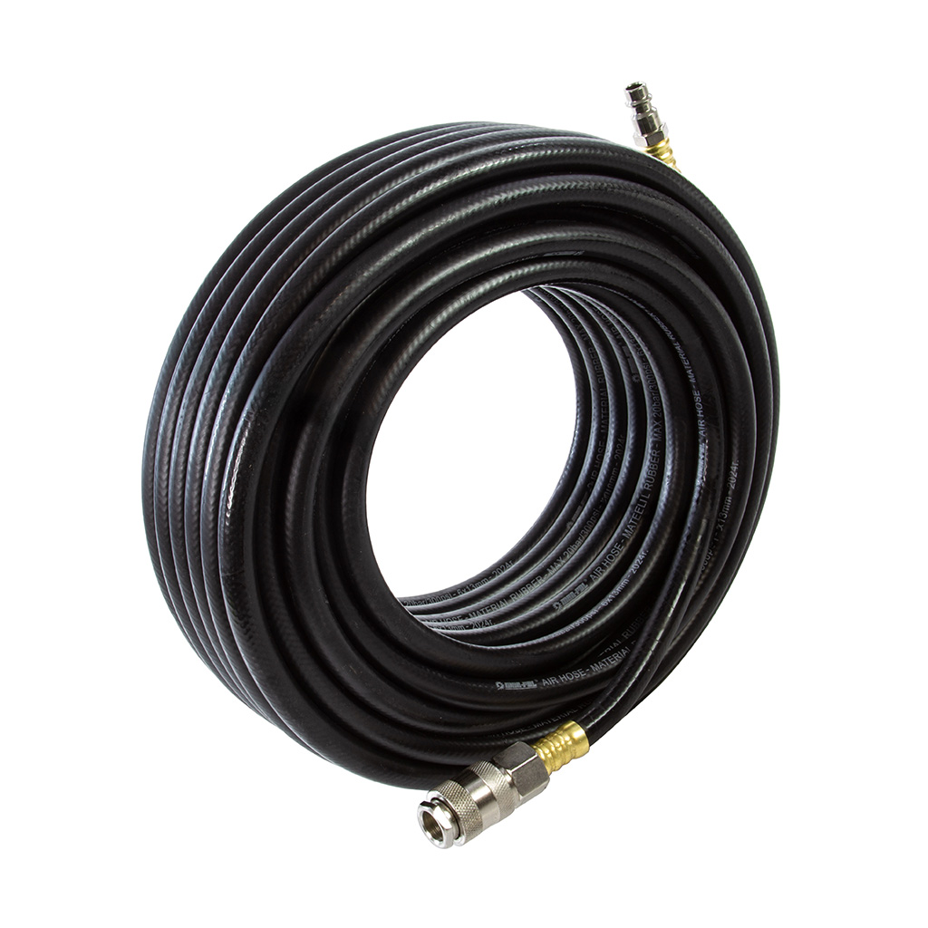Wąż pneumatyczny gumowy służy do zasilania wszystkich narzędzi pneumatycznych w tym szlifierek, pistoletów lakierniczych, młotków pneumatycznych, wiertarek, itp. Dzięki temu, że nie jest spiralny można go nawinąć na bęben. Największą zaletą jest wykonanie z gumy, która jest olejoodporna, elastyczna oraz odporna na ciśnienie. Profesjonalny zakuwany przewód ciśnieniowy 20 metrów z szybkozłączkami ➜ Długość: 20m ➜ Średnica wewnętzna: 6mm ➜ Średnica zewnętrzna: 13mm ➜ Gumowy