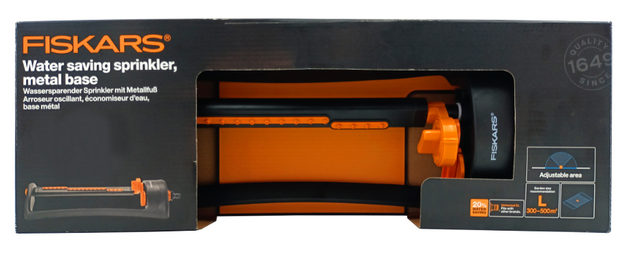 Fiskars® zraszacz oszczędzający wodę idealnie nadaje się do podlewania większych prostokątnych obszarów w ogrodzie, szczególnie polecany jest do trawników. Zastosowanie technologii oszczędzającej wodę w zraszaczu Fiskars® zmniejsza słup wody w pozycji środkowej i tym samym redukuje zużycie wody nawet o 20%. Ponadto zapewnia równomierne nawadnianie i zapobiega powstawaniu kałuż wokół zraszacza. Wygodne pokrętło umożliwia ustawianie zasięgu i kierunku zraszania – w zależności od wielkości ogrodu. Zraszacz jest wyposażony w wyjmowany filtr do zanieczyszczeń, który pozwala na proste i szybkie jego czyszczenie oraz wytrzymałą metalową podstawę.