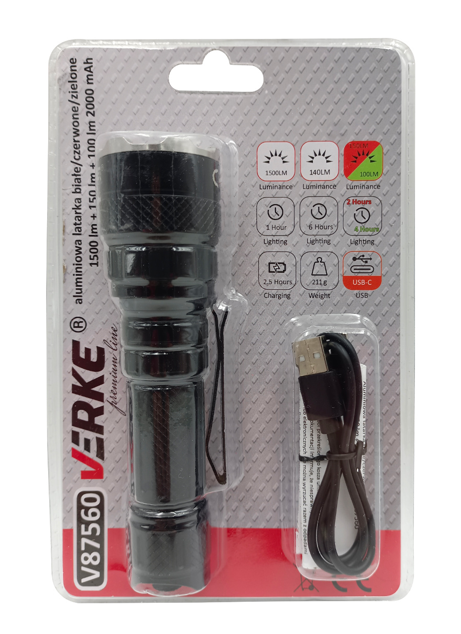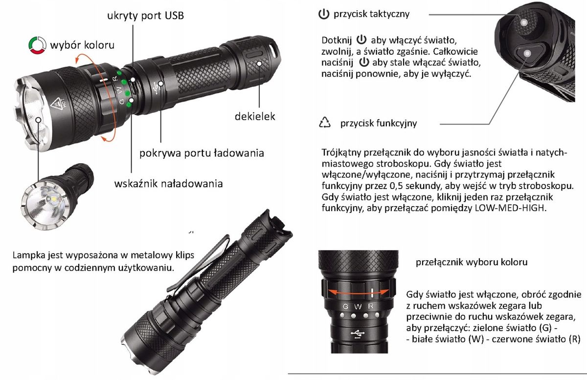 Latarka LED jest sprzętem, bez którego trudno wyobrazić sobie funkcjonalny dom, warsztat lub wyposażenie podróżnika. To one zapewniają światło w każdych okolicznościach. Emituje bardzo wydajny strumień światła 1300 lumenów, który jest super jasny. Dzięki temu można bez problemu oświetlić całe pomieszczenie. Ta taktyczna latarka jest wykonana z wysokiej jakości materiałów i może pracować przez wiele godzin. Wyposażony w nowoczesny system optyczny. Mocna Latarka Taktyczna LED została zaprojektowana z myślą o taktycznym zastosowaniu. Może być używane przez służby mundurowe, wojsko, myśliwych, miłośników przyrody lub do użytku domowego. Latarka posiada ergonomiczną oraz wygodną rękojeść. Antypoślizgowa powierzchnia zapobiega ślizganiu latarki w dłoni. Latarka akumulatorowa led z portem usb c, może być ładowana przez ładowarkę samochodową, komputer, power bank, ładowarkę ścienną USB itp. Idealny do spacerów z psami, polowań, pływania łódką, przerw w dostawie prądu, patrolowania, biwakowania, wędrówek, nagłych wypadków. Idealny prezent dla ojca, męża, żony lub studenta na każdą okazję. Korzystanie z czerwone światła na zewnątrz w ciemności zapewnia znacznie lepsze widzenie peryferyjne. Kiedy używasz białego światła oczy dostosowują się do światła, dzięki czemu widzisz tylko to, co oświetla latarka. Kiedy oczy są przystosowane do ciemności, możesz użyć czerwonego światła do oświetlenia szlaku, ale będziesz mógł również zobaczyć wszystko, co jest oświetlone przez księżyc w oddali. Czerwone światło pozwoli na odczyt danych, analizę map bez oślepiania osób towarzyszących i bez tak zwanego efektu olśnienia. Zielone światło umożliwi podchodzenie do zwierząt podczas nocnego polowania, również jest obojętne dla roślin - nie zakłóca fotoperiodu.