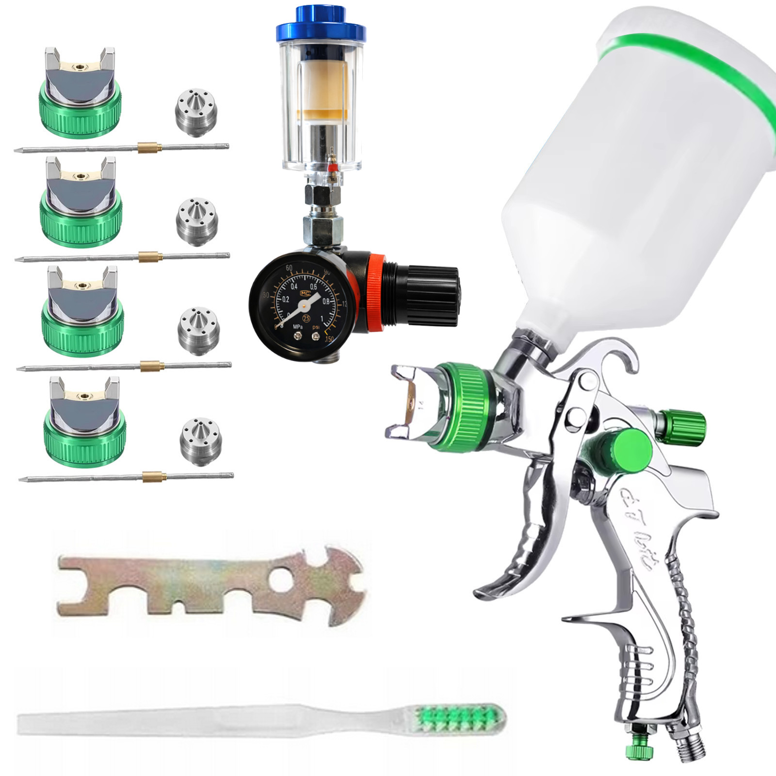 Pistolet lakierniczy wykonany w technologii HVLP - dostosowanej do niższego ciśnienia, co pozwala na oszczędności do 30% lakieru. Idealny zestaw zarówno dla profesjonalistów, jak i majsterkowiczów. Wyposażony we wszystkie niezbędne akcesoria, by zaspokoić potrzeby malowania różnych powierzchni, od samochodów po meble i ścian. ✅ Dane techniczne: Zawartość zestawu: Cztery dysze o rozmiarach 1,4mm 1,7mm 2,0mm i 2,5mm umożliwiają malowanie lakierem bazowym, podkładem oraz dużymi powierzchniami. Manometr z separatorem służy do precyzyjnej regulacji ciśnienia powietrza i filtrowania zanieczyszczeń w strumieniu powietrza. Oczyszcza sprężone powietrze z wilgoci, oleju, kondensatu i cząstek stałych. Filtruje sprężone powietrze z kropel wody, które powodują zacieki podczas malowania czy też korozję innych narzędzi. Manometr pozwala na dokładne monitorowanie ciśnienia powietrza docierającego do pistoletu, co jest kluczowe dla uzyskania jednolitego i kontrolowanego natrysku. Skala na manometrze jest wyraźna i łatwa do odczytu, co umożliwia precyzyjną regulację. Pistolet wyposażony w zawór regulacji przepływu farby, zawór kontroli szerokości natrysku oraz zawór regulacji ciśnienia powietrza, zapewnia pełną kontrolę nad procesem malowania. Czyszczenie i konserwacja pistoletu