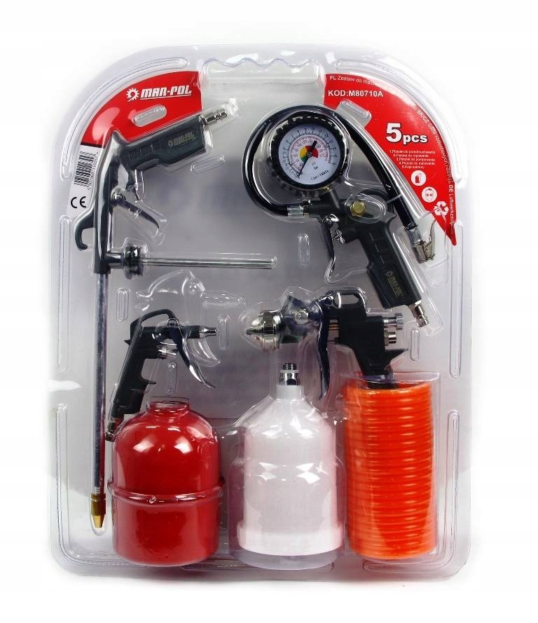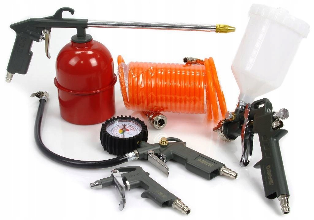 Zestaw pneumatycznych narzędzi lakierniczych do malowania, lakierowania, przedmuchiwania, ropowania i pompowania. - Pistolet do lakierowania górny zbiornik z przykrywką i dyszą 1.5mm średnica dyszy 1,5 mm (iglica mosiężna)regulacja ilości oraz strumienia lakieruregulacja ciśnienia powietrzaaluminiowy korpus i zbiornik o pojemności 600 mlzalecane ciśnienie pracy od 3 do 5 barówgwint 1/4 cala , mocowanie - szybkozłączka - Pistolet z końcówką i manometrem do pompowania kół długość węża 350mmzakończony szybko złączami euro 1/4"skala do 16 bar lub 220 psigumowa obudowa zegarawyposażony w zawór spustowy powietrza - Pistolet do przedmuchiwania powietrzem maksymalne ciśnienie robocze 8 barw całości wykonany z metalupodłączenie na szybo złączkę - Pistolet dolny zbiornik do ropowania maksymalne ciśnienie robocze 7 barw całości wykonany z metalupodłączenie na szybo złączką - 5m węża spiralnego polietylenowy przewód pneumatycznydługość 5 metrówzakończony szybkozłączkami /żeńska i męska/średnica przewodu: wewn. 6mm / zewn. 8mmMaksymalne Ciśnienie robocze 8 barZESTAW LAKIERNICZY DO MALOWANIA PISTOLET SPRĘŻARKA