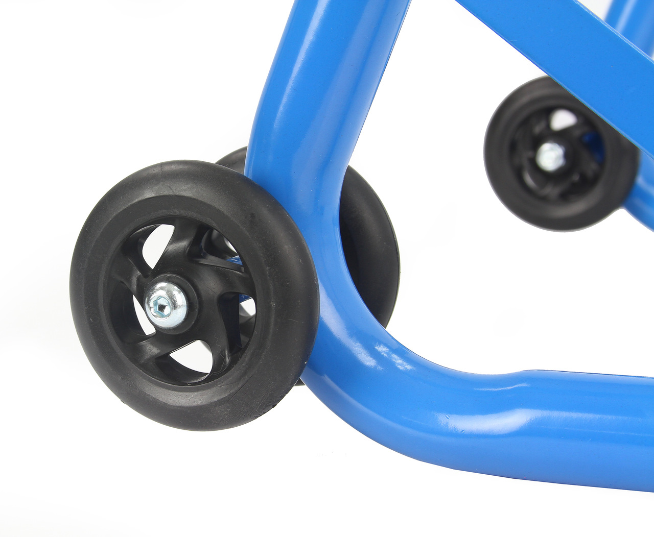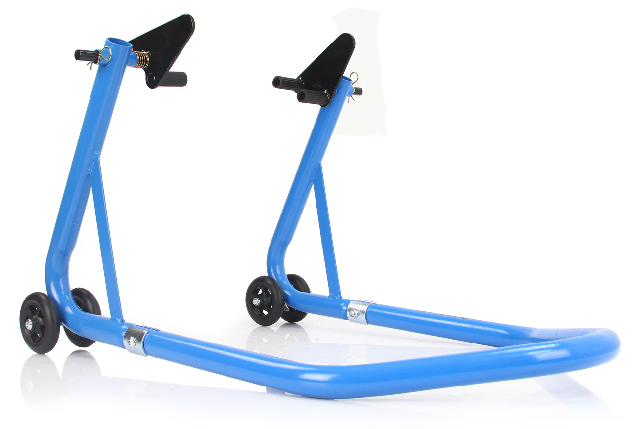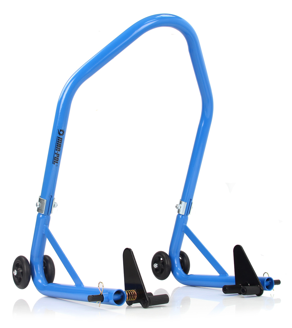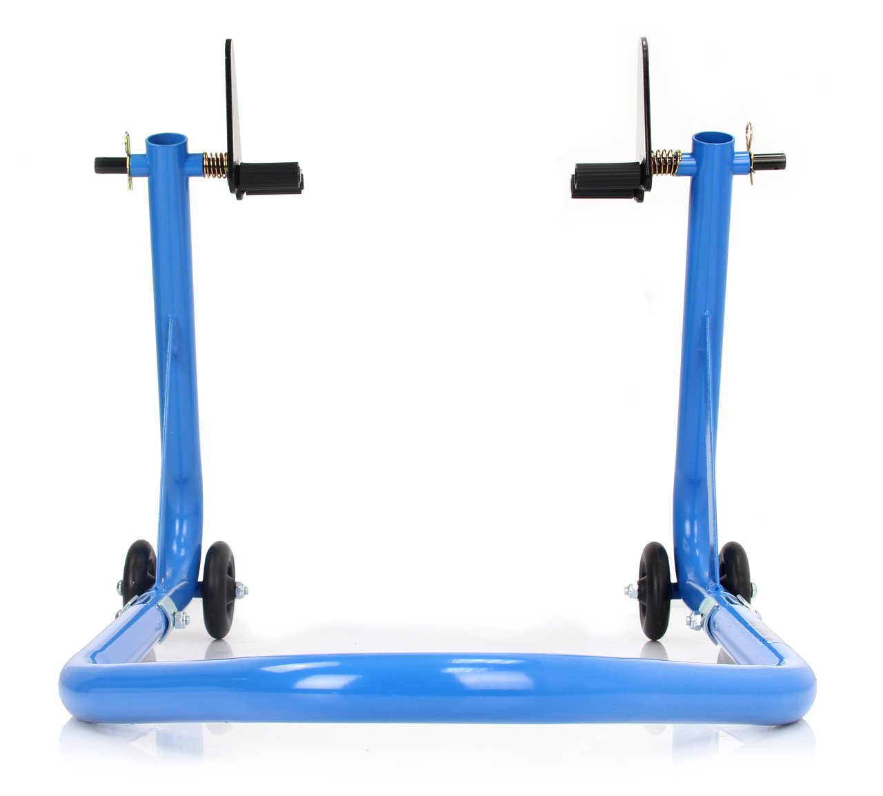 Przystosowany do udźwigu 280 kg Średnica rury 32,5mm Solidna i prosta konstrukcja Rozstaw mocowania adaptera: 27cm do 33cm Rozstaw kół 33,5cm od wewnętrznej Rozstaw kół 50cm od zewnętrznej Wysokość w pozycji leżącej 37cm Pasuje pod 99% goleni motocyklowych Idealny do podstawowych czynności serwisowych, takich jak obsługa serwisowa klocków hamulcowych, opony, czyszczenia felgi, zimowania motocykla Łatwa regulacja rozstawu podstawy