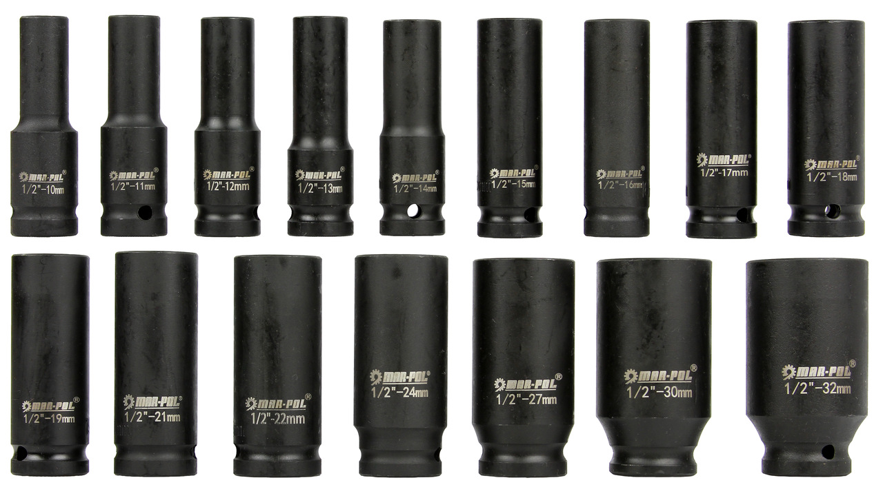 Zestaw wysokiej jakości nasadek udarowych 1/2" MAR-POL® 10 - 32 mm. Nasadki udarowe wykonane z wysokiej jakości stali. Nasadki przeznaczone do stosowania w elektronarzędziach, narzędziach akumulatorowych czy pneumatycznych z napędem udarowym. Idealne do warsztatów samochodowych, wulkanizacyjnych oraz serwisów. Precyzja wykonania nasadek MAR-POL ® gwarantuje wysoką jakość i trwałość podczas użytkowania. Nasadki sprawdzą się na kluczach pneumatycznych, krzyżakowych czy przekładniowych. Gniazdo nasadki jest wykonane z dużą dokładnością, zgodnie z najwyższymi klasami dokładności określonymi w normach.