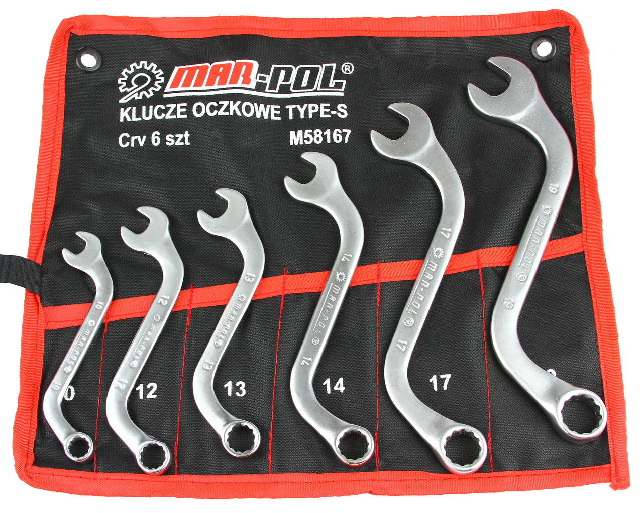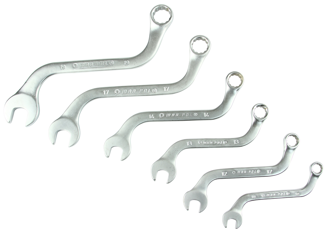 Zestaw kluczy oczkowych wygiętych, dzięki specjalnemu profilowi w kształcie litery S umożliwia odkręcanie śrub w miejscach niedostępnych dla innych narzędzi. Specyficzny kształt klucza ułatwia odkręcanie kolektorów, alternatorów i rozruszników samochodowych. Wysokogatunkowa stal chromowo-wanadowa zapewnia długoletnią wytrzymałość kluczy. Zestaw zapakowany w poręcznym pokrowcu. Klucze są bardzo solidnie i dokładnie wykonane z wysokogatunkowej stali odpornej na korozję. Idealne do użytkowania w miejscach trudno dostępnych. Łatwe i szybkie dokręcanie i odkręcanie w najtrudniejszych warunkach. Zabezpieczenie antykorozyjne.