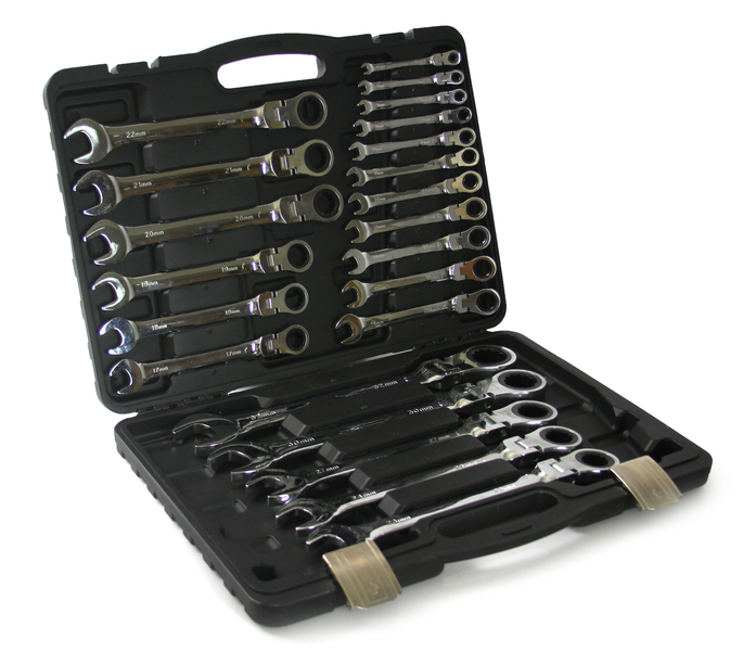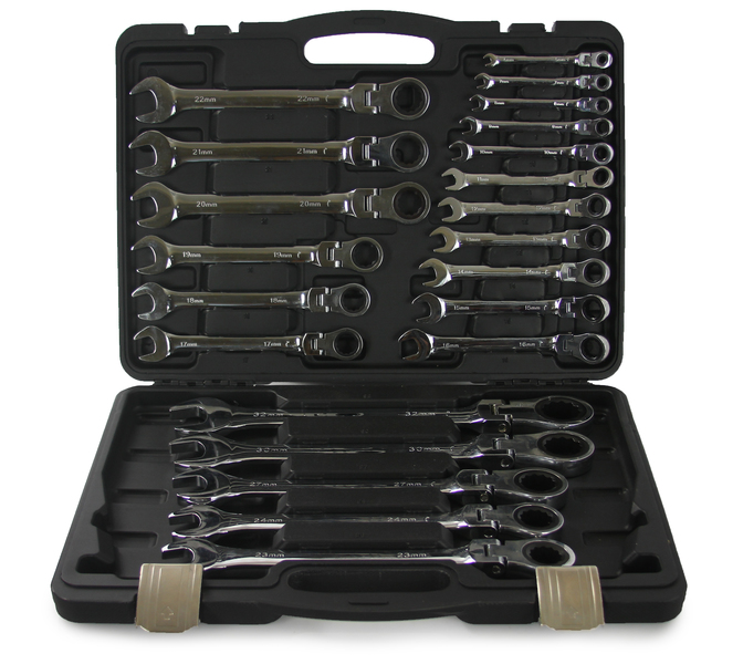 Zestaw kluczy płasko - oczkowych z GRZECHOTKĄ 22 el 6 - 32 mm MAR-POL Uniwersalny zestaw kluczy 22 elementów ze stali CHROME VANADIUM. Klucze płasko - oczkowe znakomite dla amatorów jak i profesjonalistów. Są one bardzo wytrzymałe, wykonane z materiału chromowo-vanadowego (CRV - stal narzędziowa) Mocny mechanizm zębatkowy wykonany z hartowanej stali, pozwalający na niewielki, tylko 5o skok klucza (zwykły klucz wymaga 30° skoku, lub 6 razy większej powierzchni) Klucz płasko – oczkowy może z powodzeniem zastąpić profesjonalną grzechotkę szybko mocującą, a zarazem ma znacznie mniejsze rozmiary - co pozwala na dostęp do ciasnych miejsc Szeroki zakres zastosowań, klucz pozwala na pracę z połączeniami gwintowanymi Zawartość zestawu: