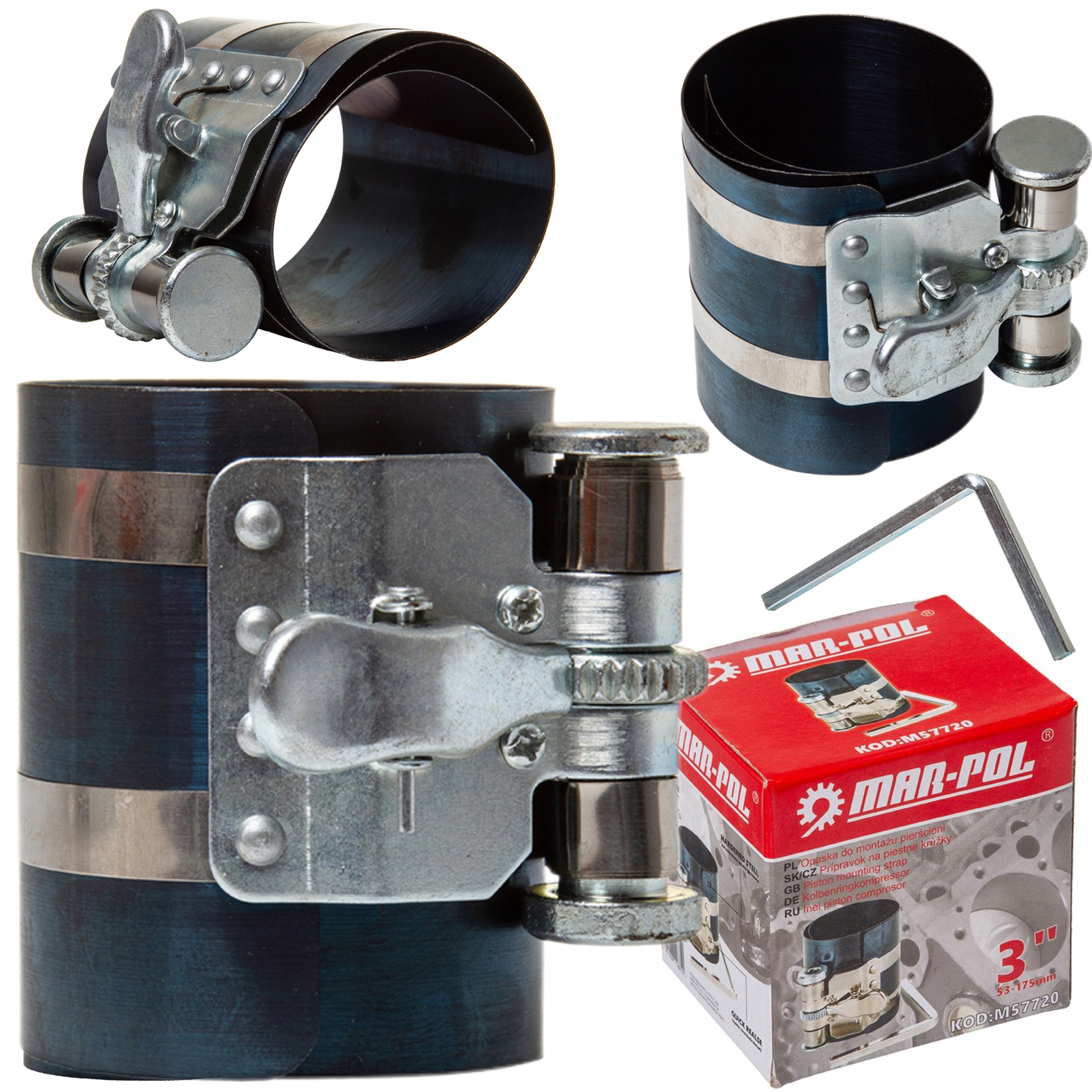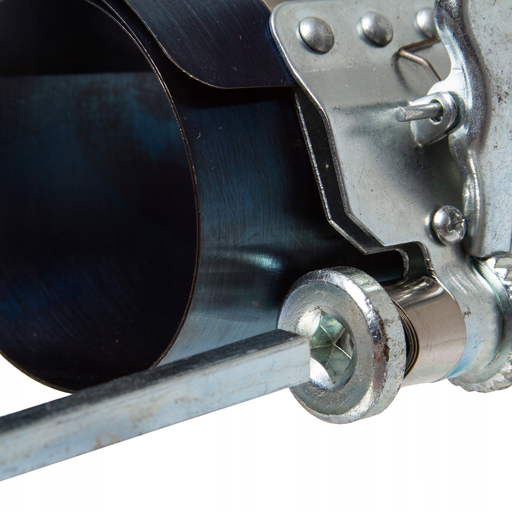 ⭐️OPASKA DO MONTAŻU PIERŚCIENI TŁOKOWYCH 53 - 175 MM ⭐️Szeroki zakres pracy zapewnia pełną uniwersalność. Opaska wykonana z wytrzymałej i sprężystej blachy, wyposażona automatyczną blokadę, którą można zwolnić przyciskiem. ⭐️Posiada precyzyjna przekładnię ślimakową. W zestawie klucz do dociągania opaski.OPASKA, ZACIK DO MONTAŻU PIERŚCIENI TŁOKOWYCH 3" 53 - 175 MM