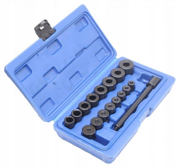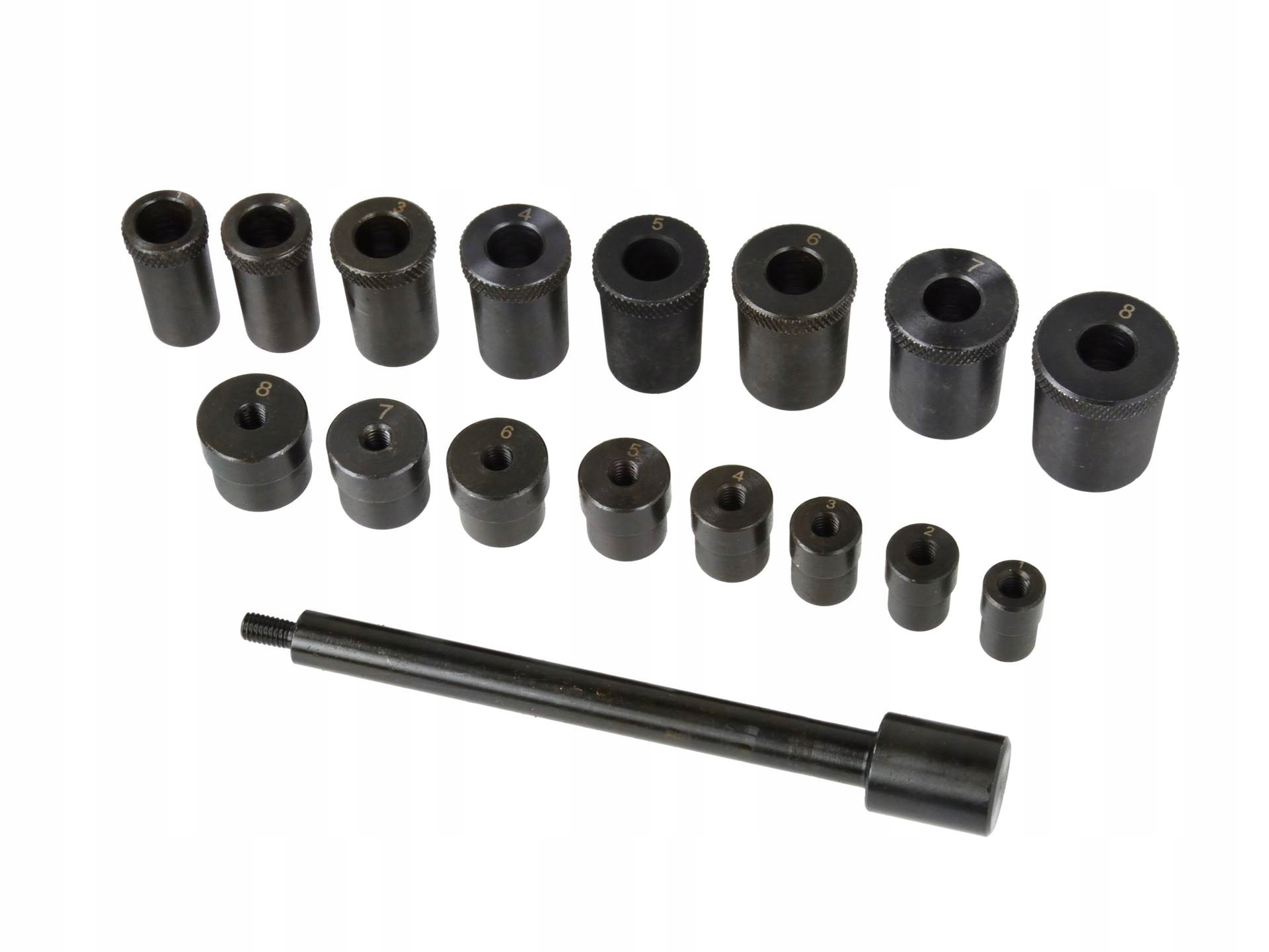 Zestaw przystosowany do szybkiego i dokładnego demontażu osiowego łożysk, uszczelniaczy, tulei np. alternatorów, zwrotnic, korbowodów oraz rozruszników itp.. Pierścienie centrujące oraz wybijające zostały wykonane w sposób precyzyjny ze stali chemicznie oksydowanej, co daje gwarancję dokonania wymian łożysk osiowych bez żadnych uszkodzeń. Przyrząd używany jest do samochodów osobowych i dostawczych. Zestaw zawiera: Rękojeść do pobijania 140mm 8 stożkowych pierścieni centrujących - 15.5 x 14.2 x 26.6mm - nr.1 - 16.7 x 15.4 x 27.0mm - nr.2 - 19.0 x 17.5 x 28.0mm - nr.3 - 20.0 x 18.6 x 27.5mm - nr.4 - 21.4 x 20.0 x 27.4mm - nr.5 - 23.0 x 21.6 x 27.5mm - nr.6 - 23.5 x 22.0 x 27.5mm - nr.7 - 26.6 x 24.2 x 27.5mm - nr.8 8 stożkowych pierścieni wybijających - 12.6 x 10.8 x 19.2mm nr. 1 - 14.8 x 12.2 x 19.4mm - nr.2 - 15.0 x 13.5 x 19.3mm - nr.3 - 16.0 x 14.7 x 19.7mm - nr.4 - 17.7 x 15.8 x 19.4mm - nr.5 - 19.0 x 17.1 x 19.3mm - nr.6 - 20.0 x 18.3 x 19.1mm - nr.7 - 21.6 x 20.0 x 19.1mm - nr.8