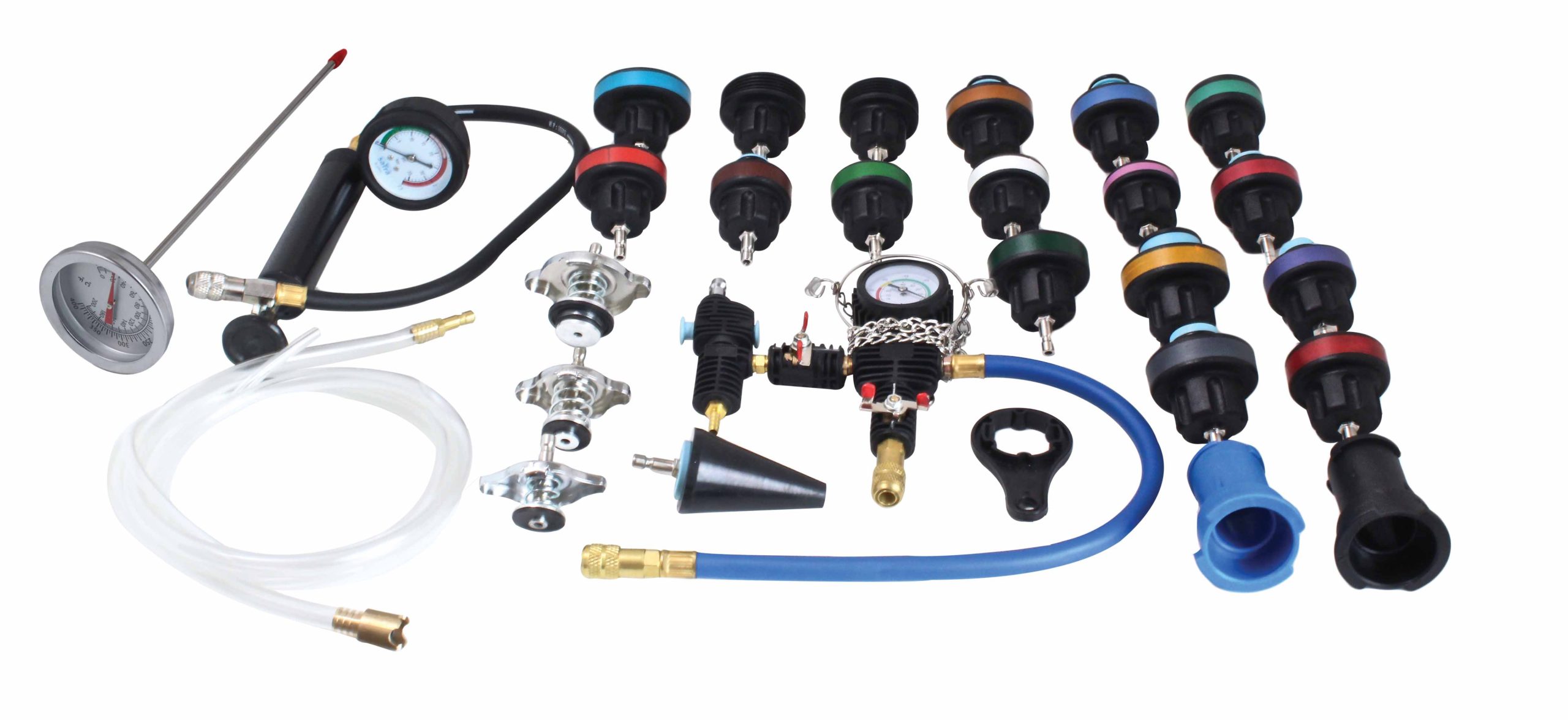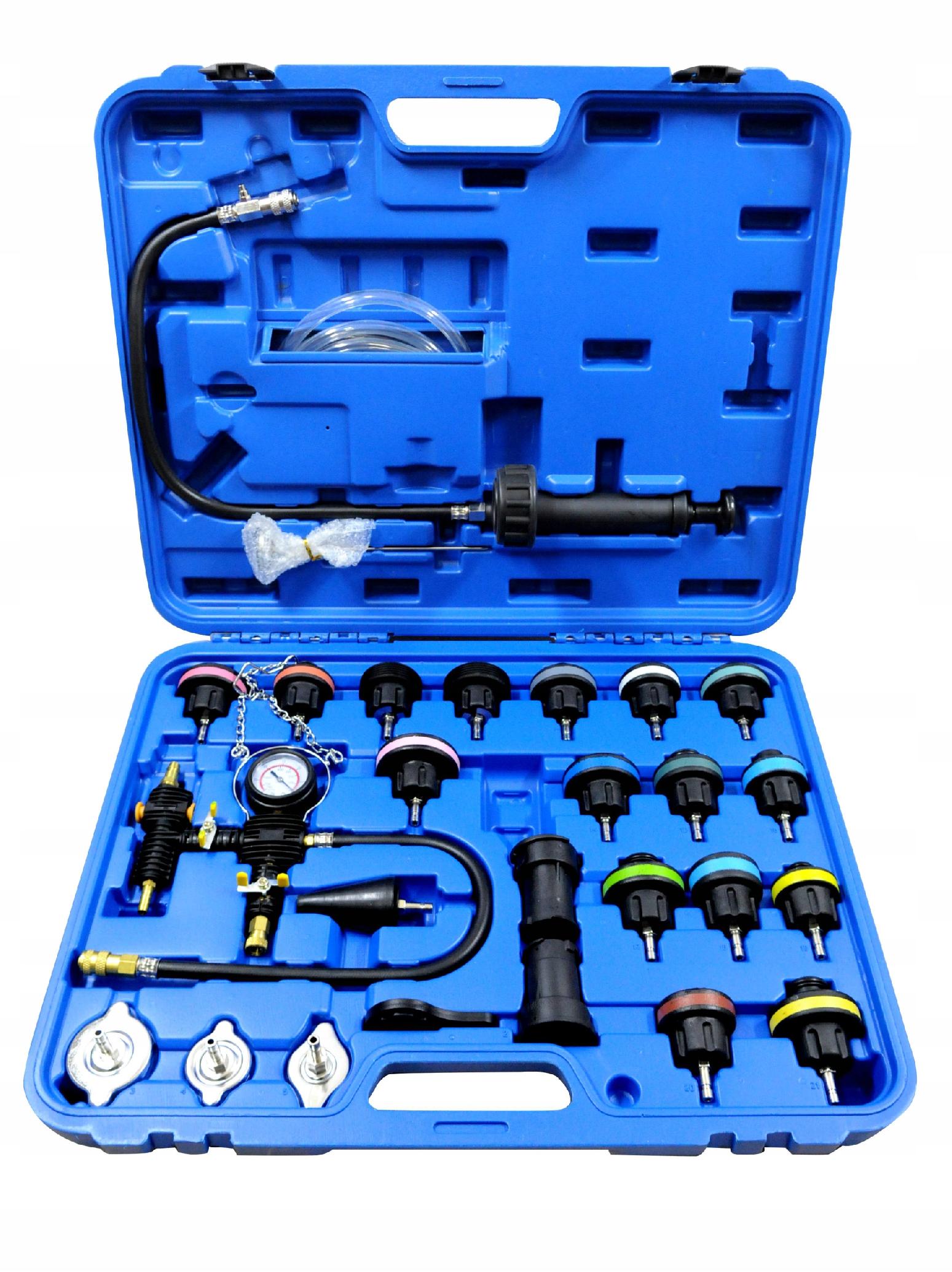 27 elementowy zestaw do testowania przecieków w chłodnicy, a tak że dokonania szybkiej zmiany chłodziwa.