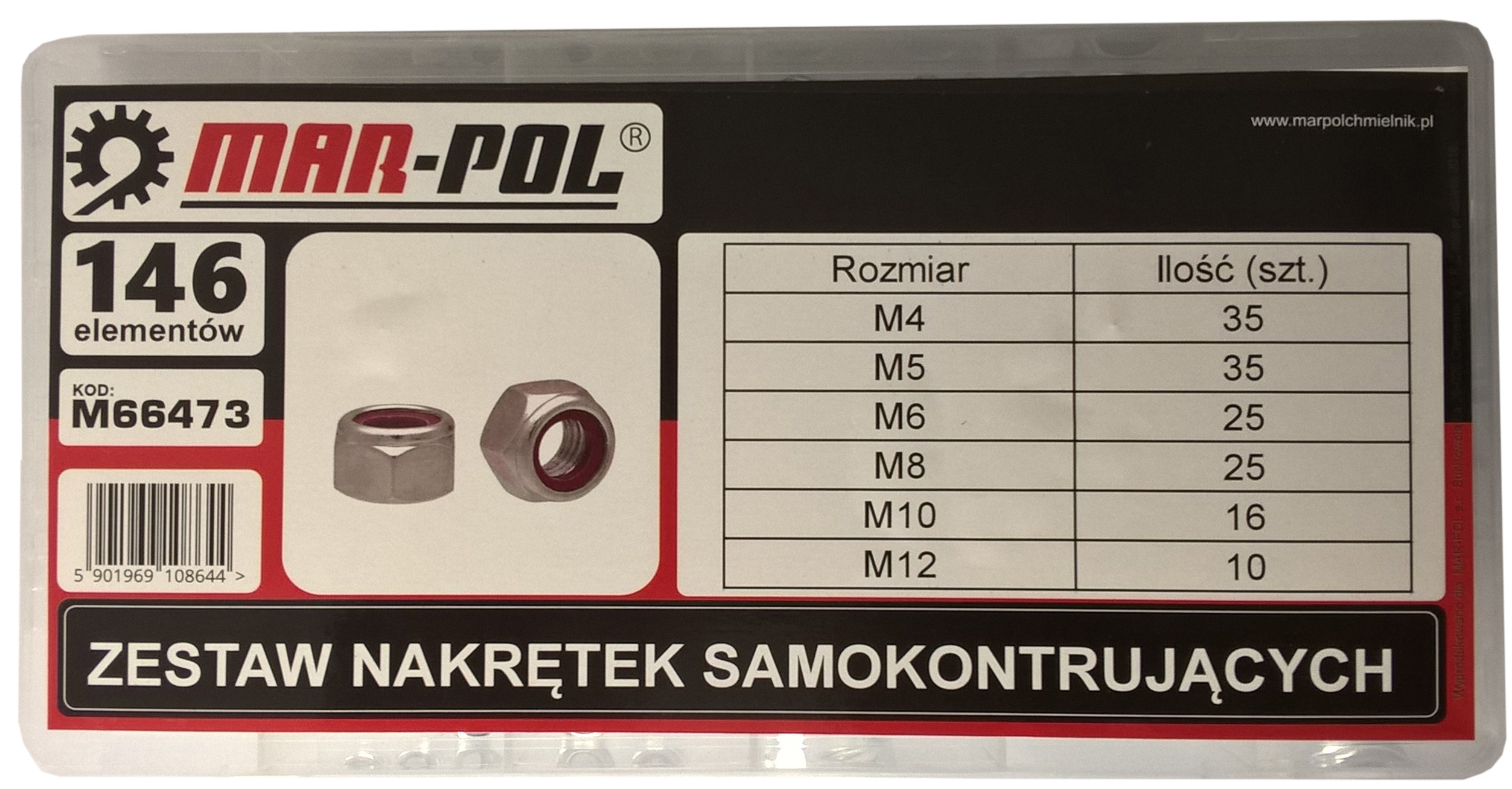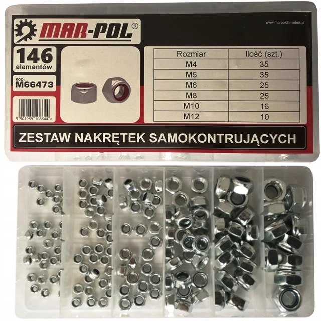 Komplet 146 sztuk nakrętek samokontrujących z wkładką nylonową wykonane zostały z wysokiej jakości metalu. Różnorodność rozmiarów w zestawie daje pewność, że znajdziemy odpowiedni, potrzebny rozmiar. Zestaw znajduje zastosowanie w każdym profesjonalnym warsztacie. Całość zapakowana jest w plastikowym pojemniku, w którym każdy rodzaj nakrętki ma swoje oznaczone miejsce. Nakrętki samokontrujące, samohamowne z wkładką nylonową zapobiegają samodzielnemu luzowaniu i odkręcaniu. Są one odporne na wstrząsy i drgania. Znajduje swoje zastosowanie między innymi: W praktycznym, pojemnym opakowaniu z przegródkami znajduje się 146 nakrętek samokontrujących. Poniżej prezentujemy poszczególne elementy zestawu: Firma MAR-POL powstała w 2000 roku. Początek działalności przedsiębiorstwa opierał się na sprzedaży narzędzi i elektronarzędzi wiodących marek polskich i zagranicznych. Z czasem zdobyte doświadczenie pozwoliło poszerzyć ofertę produktów i rozpocząć produkcję oraz import własnego sprzętu. Obecnie MAR-POL jest jedną z najbardziej konkurencyjnych firm z Europy Środkowej oferujących szerokiej maści narzędzia. Wszystkie produkty MAR-POL charakteryzują się dbałością o szczegóły w osiągnięciu jakości oraz dostępności cenowej dla każdego Klienta. Szeroki asortyment gwarantuje pełną satysfakcję zarówno amatorom-hobbystom, jak i użytkownikom profesjonalnym.