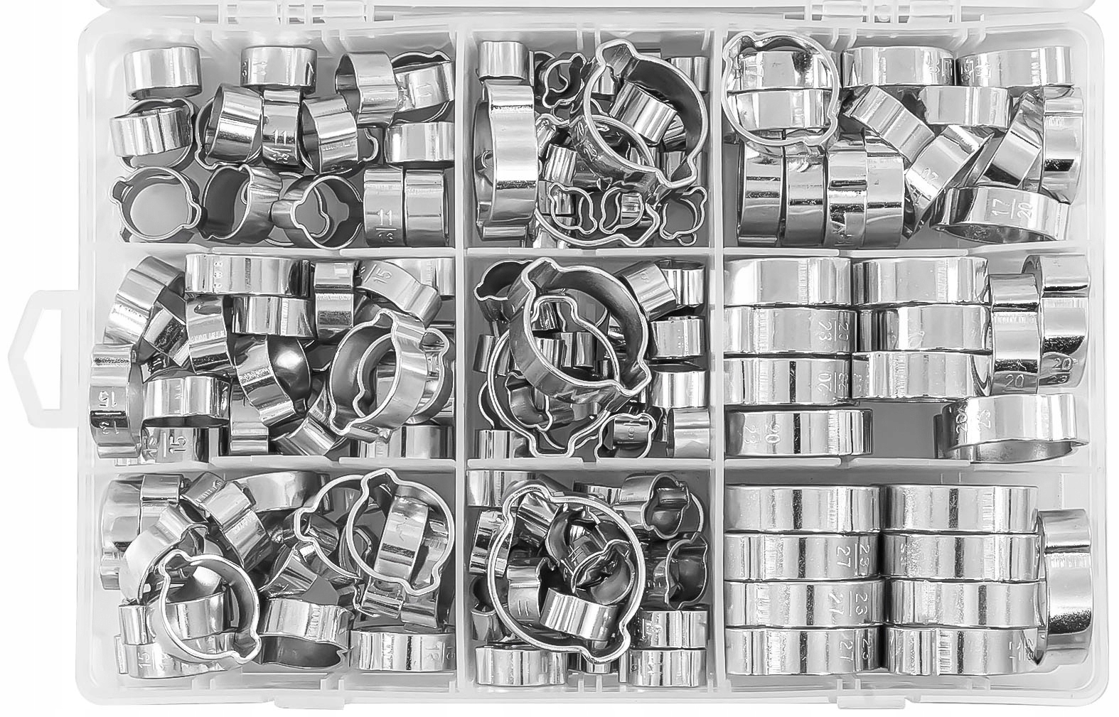 Zestaw zawiera 175 obejm stalowych ocynkowanych o rozmiarach: