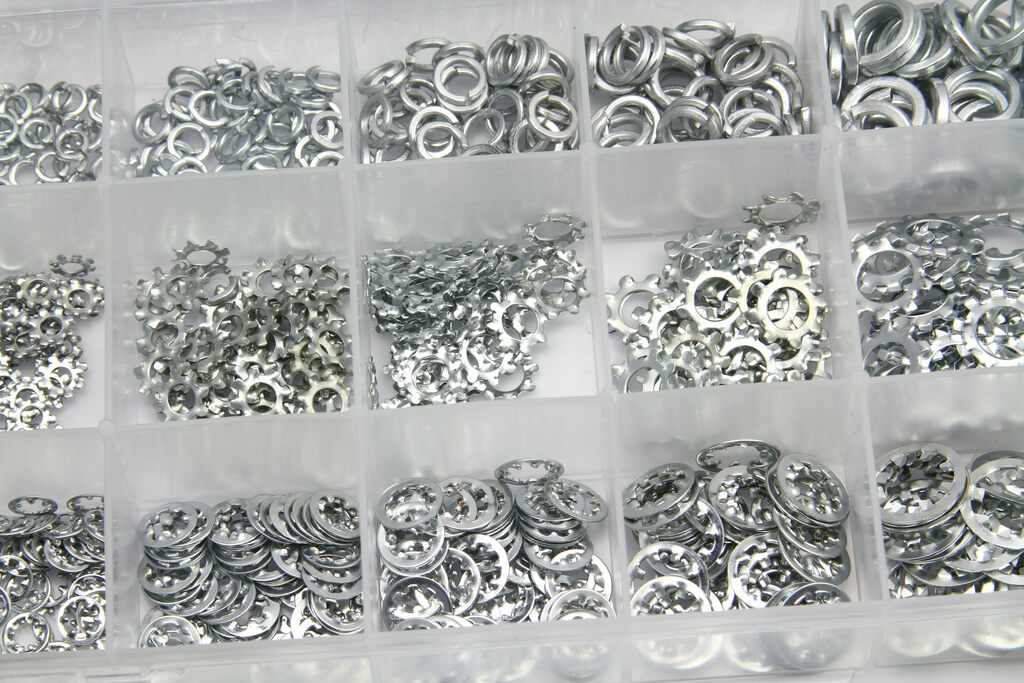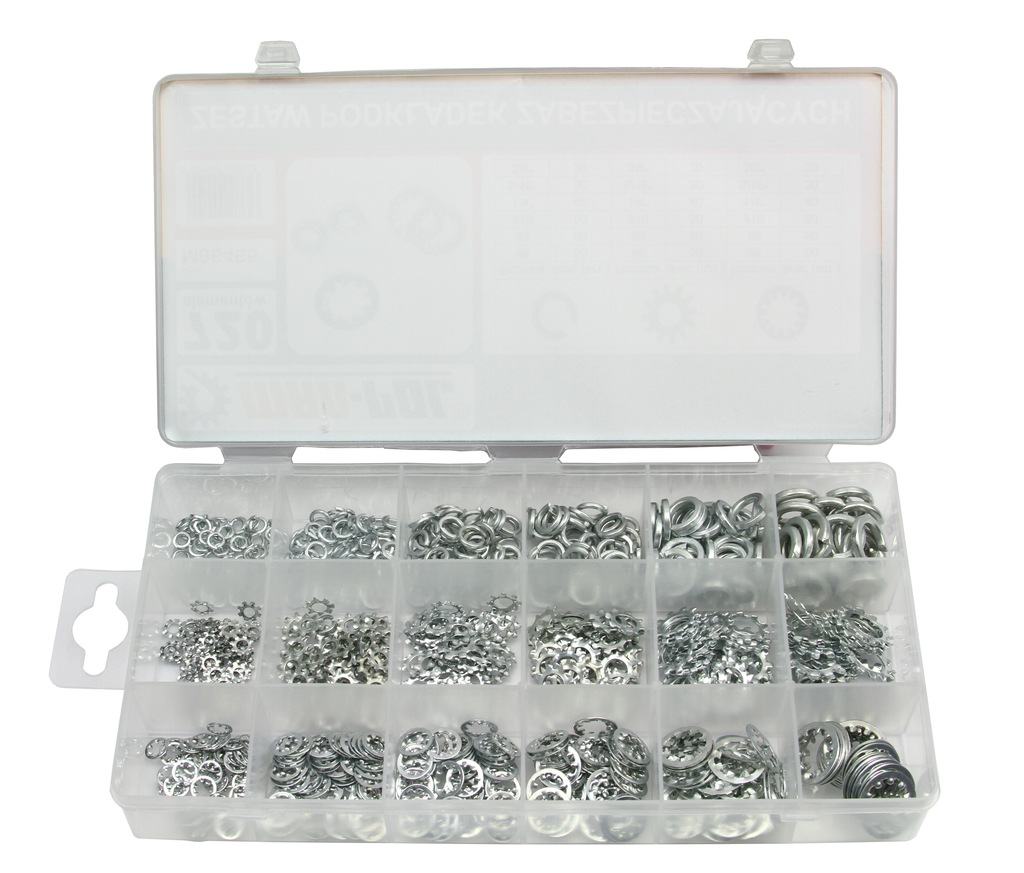Zestaw zawiera 3 rodzaje podkładek w 18 popularnych rozmiarach Zapakowane w wygodny sortownik Podkładki wykonane są ze stali ocynkowanej.