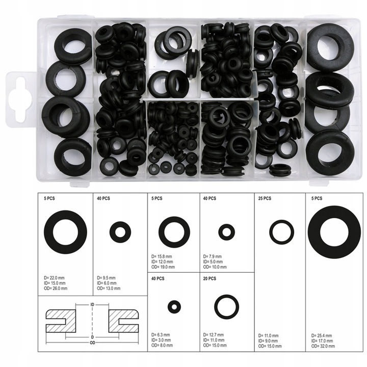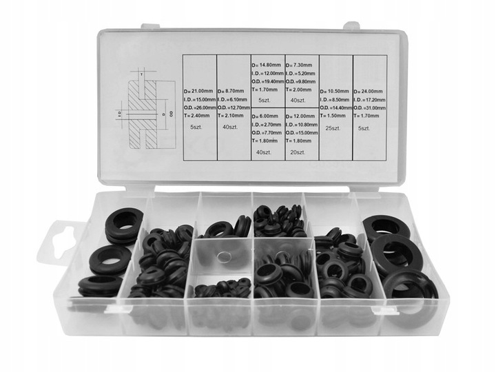 Zestaw 180 przelotek gumowych. Przelotki chronią przed uszkodzeniem przez ścieranie, gdy przewody przechodzą przez otwory w metalu, plastiku lub innych twardych materiałach. ✅ Zawartość zestawu: