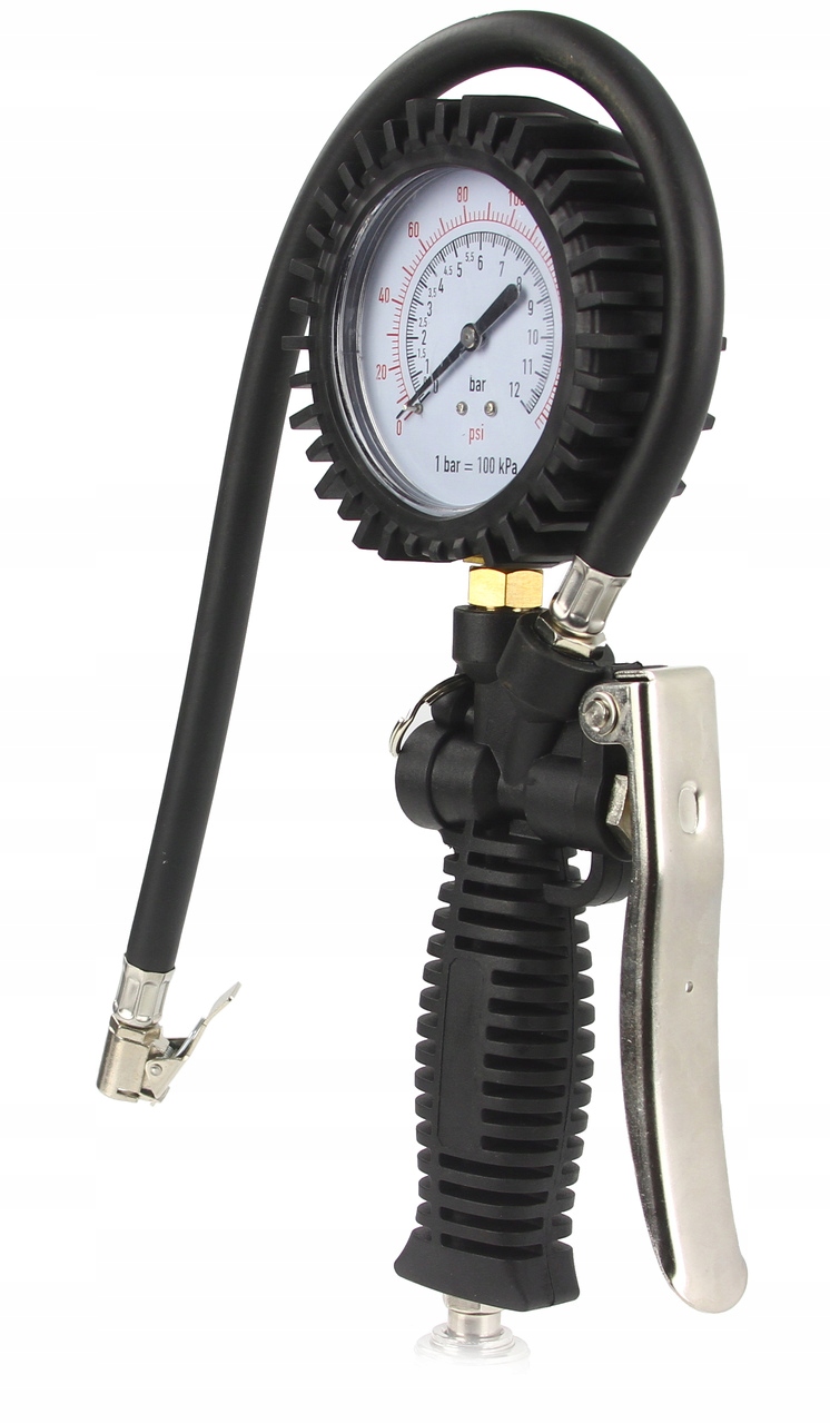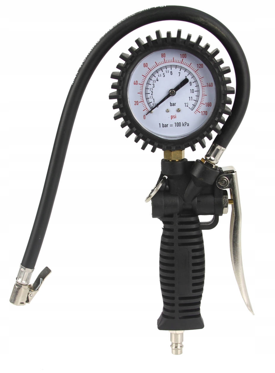 Pistolet jest standardowym pistoletem znajdującym się na wyposażeniu większości serwisów ogumienia. Manometr, w który jest wyposażony, ma skalę pozwalającą mierzyć ciśnienie do 12 barów. Ponad to manometr ten jest zaopatrzony w osłonę ochronną zapobiegającą uszkodzeniom. Manometr mocowany jest do korpusu pistoletu za pomocą metalowego standardowego gwintu pozwalającego na wymianę go na nowy (w przypadku uszkodzenia). Korpus pistoletu posiada uchwyt na powieszenie go, oraz standardową końcówkę do szybkozłącza. Cechy PISTOLET DO POMPOWANIA KÓŁ Z MANOMETREM