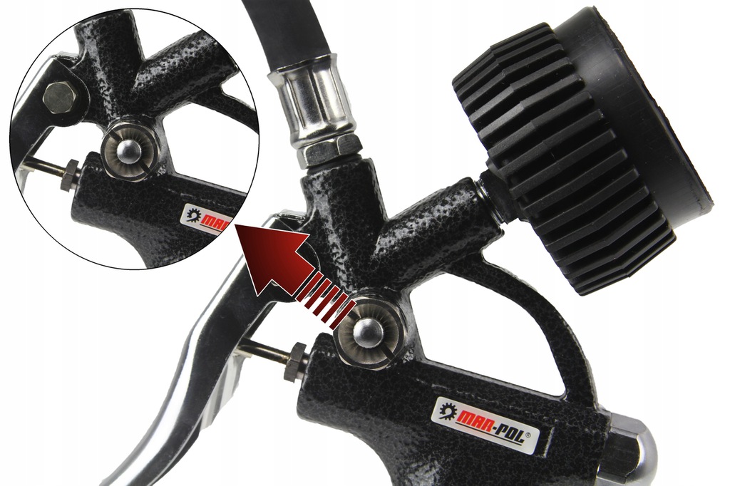 PISTOLET DO POMPOWANIA MAR-POL Z MANOMETREM, GUMA / M80702 Pistolet wyposażony jest w standardowe szybkozłącze stosowane w europejskich narzędziach pneumatycznych. Zalety: Zalety Pistolet do pompowania wyposażony w precyzyjny manometr, który umożliwia kontrolę ciśnienia powietrza w pompowanym produkcie. Obudowany gumą co zapewnia mu dodatkową ochronę przed uszkodzeniem. Elementy zestawu wykonane z wysokiej jakości materiałów. Dane techniczne: Zakres pracy 0-10 bar oraz 0 - 150 PSI Szybko-złącze 1/4" Wyposażony w zawór spustowy