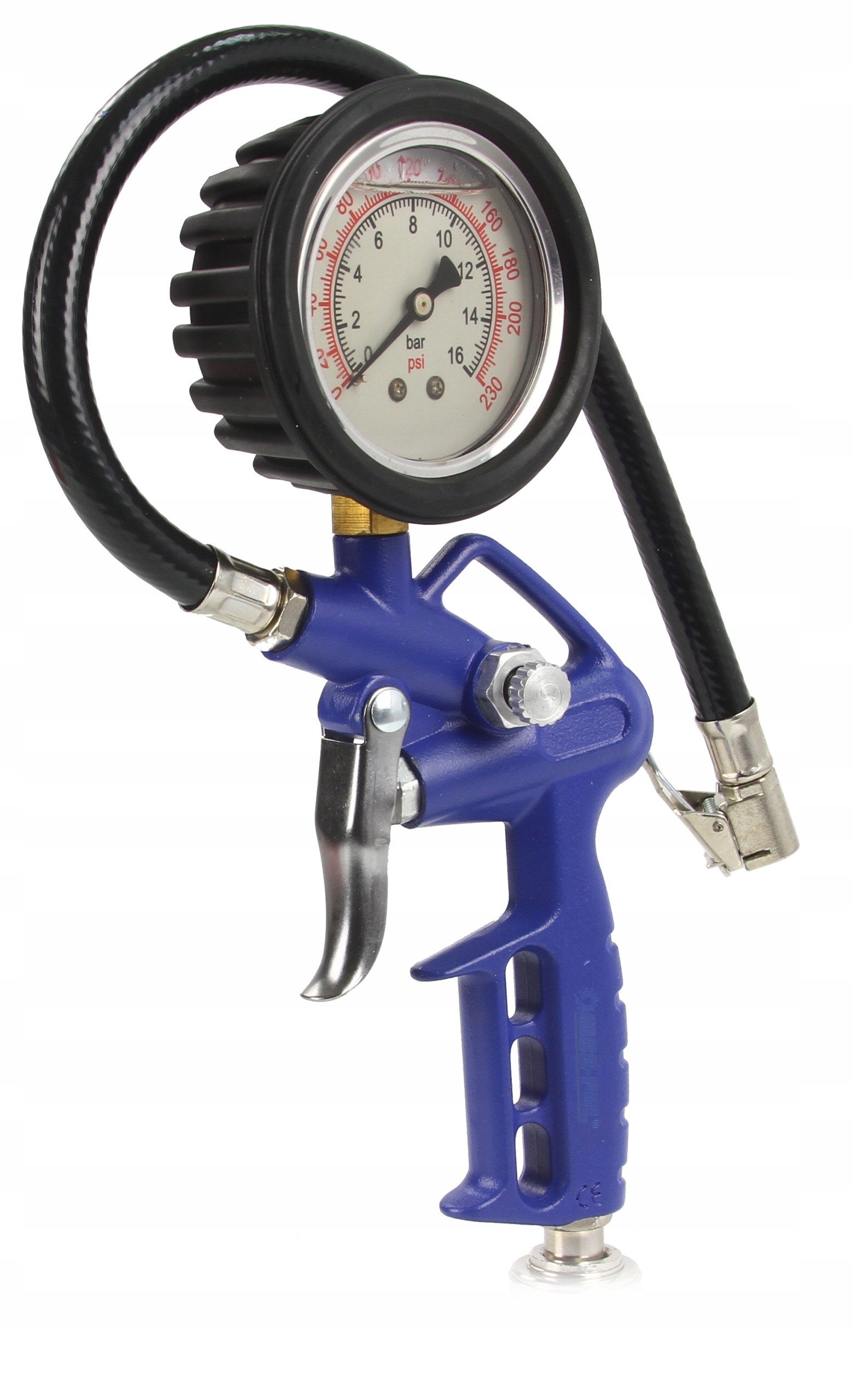 Pistolet wyposażony jest w standardowe szybkozłącze stosowane w europejskich narzędziach pneumatycznych. Wyposażony w dedykowany zawór spustowy służący do bezpiecznego upuszczania powietrza Pistolet do pompowania wyposażony w precyzyjny manometr, który umożliwia kontrolę ciśnienia powietrza w pompowanym przedmiocie. Obudowany gumą co zapewnia mu dodatkową ochronę przed uszkodzeniem. Elementy zestawu wykonane z wysokiej jakości materiałów.
