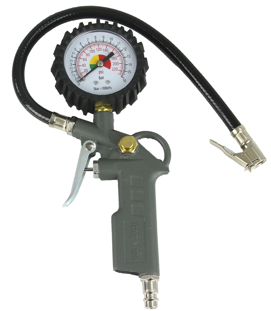 Pistolet pneumatyczny do pompowania kół. Posiada duży, czytelny manometr, zabezpieczony gumową osłoną. Wyposażony jest w mechanizm spuszczania powietrza. Skala od 0 - 16 BAR. Doskonały do pompowania i kontroli ciśnienia. Pistolet do pompowania wyposażony w precyzyjny manometr, który umożliwia kontrolę ciśnienia powietrza w pompowanym produkcie. Obudowany gumą co zapewnia mu dodatkową ochronę przed uszkodzeniem. Elementy zestawu wykonane z wysokiej jakości materiałów.
