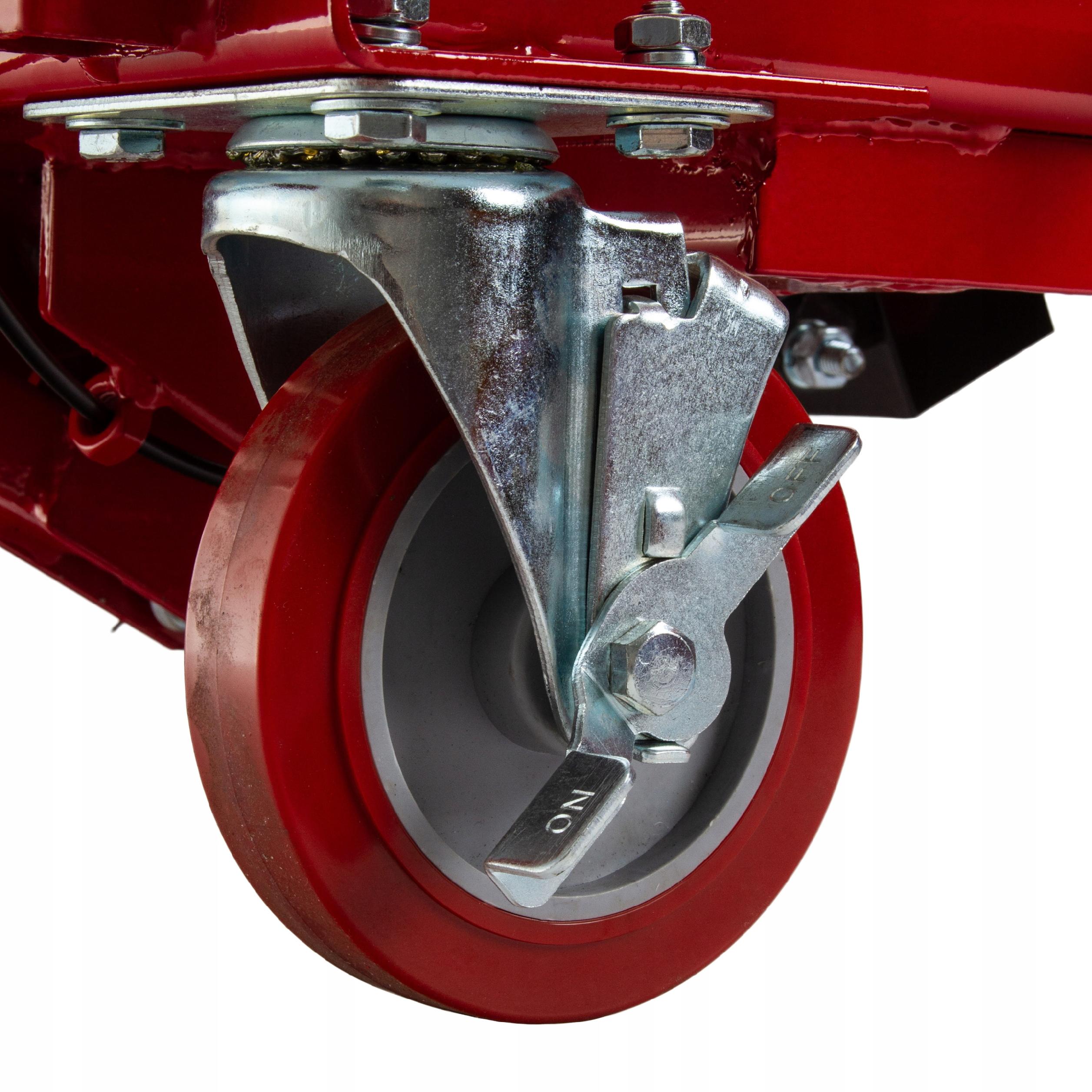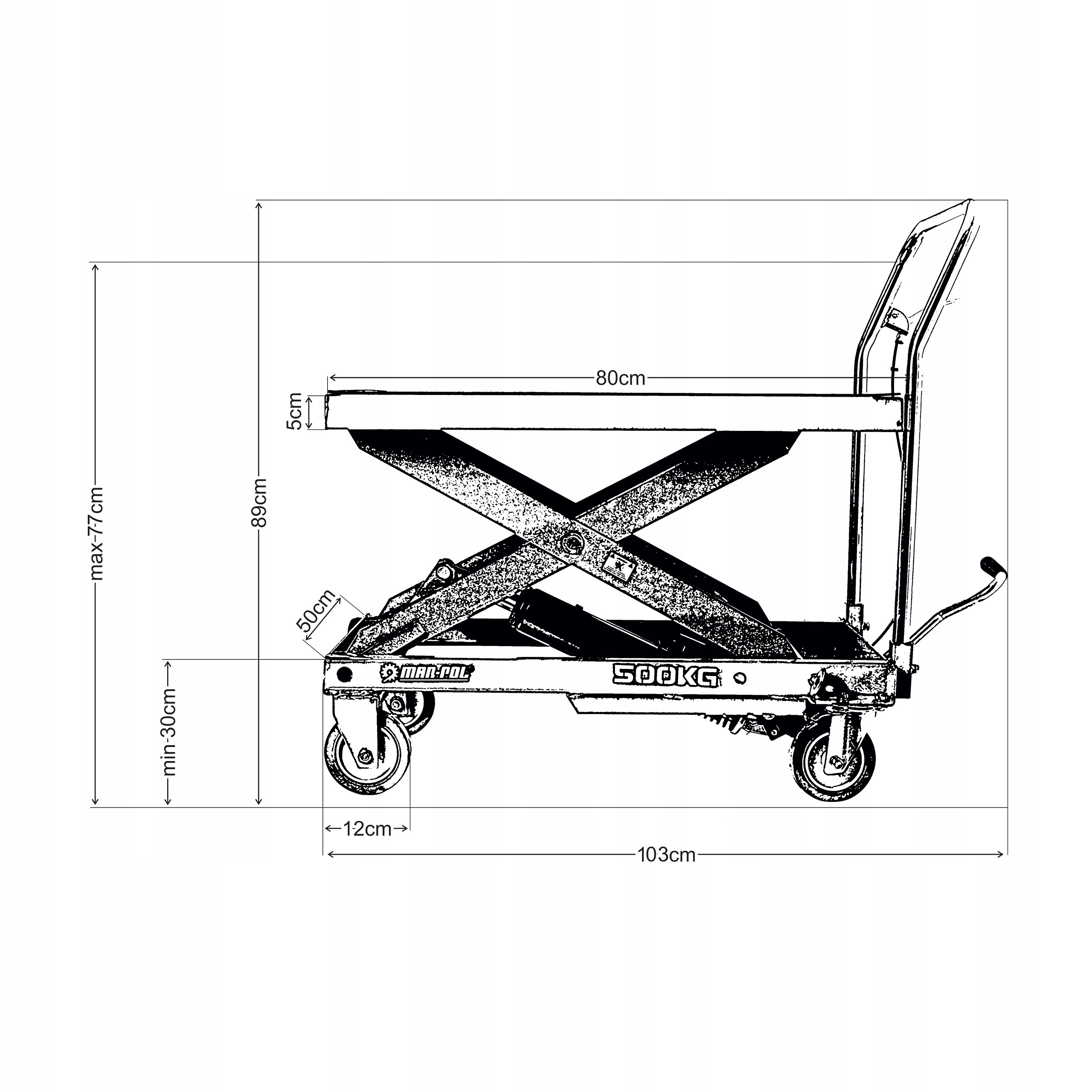 ✅ Udźwig 500 kg! ✅ Podnoszenie na wysokość aż 770 mm! ✅ Stabilna konstrukcja z nożycowym mechanizmem podnoszenia. ✅ Kompaktowe wymiary stołu: 800 x 500 mm. ✅ Bezstopniowe opuszczanie z możliwością regulacji prędkości. ✅ Niska minimalna wysokość stołu – tylko 300 mm! ✅ Ergonomiczna rączka dla komfortu obsługi. Nasz wózek nożycowy platformowy został zaprojektowany z myślą o maksymalnej wydajności i bezpieczeństwie użytkownika, co czyni go idealnym wyborem dla profesjonalistów poszukujących niezawodnych rozwiązań. ✅Wózek nożycowy platformowy to niezastąpione narzędzie w magazynach, warsztatach i zakładach produkcyjnych. Charakteryzuje się maksymalną wysokością podnoszenia 770 mm, minimalną wysokością 300 mm oraz wymiarami stołu 800x500 mm. Udźwig wózka wynosi 500 kg, co pozwala na bezpieczne transportowanie cięższych przedmiotów. Solidna konstrukcja i wysokiej jakości materiały zapewniają długą żywotność i odporność na uszkodzenia. Ergonomiczny design oraz płynny mechanizm podnoszenia gwarantują komfort i efektywność pracy. Idealny do pracy na różnych poziomach wysokości i w różnych warunkach roboczych. ✅Posiada on maksymalną wysokość podnoszenia wynoszącą 770 mm oraz minimalną wysokość 300 mm, co umożliwia łatwe podjeżdżanie pod różnorodne przeszkody i dostosowanie do specyficznych warunków roboczych. Wymiary stołu to 800x500 mm, co oferuje wystarczającą przestrzeń do bezpiecznego umieszczania ładunków, a maksymalny udźwig wynoszący 500 kg sprawia, że wózek doskonale nadaje się do transportu cięższych przedmiotów bez obawy o przeciążenie. Wymiary: Ergonomiczna rączka do bezstopniowego opuszczania platformy w wózku nożycowym platformowym została zaprojektowana z myślą o maksymalnym komforcie i precyzji obsługi. Jej wygodny kształt umożliwia pewny chwyt, co pozwala na łatwe i intuicyjne operowanie mechanizmem opuszczania. Bezstopniowa regulacja sprawia, że operator może płynnie dostosować prędkość opuszczania platformy do aktualnych potrzeb, co jest szczególnie istotne przy delikatnych ładunkach. Taka konstrukcja gwarantuje nie tylko wygodę, ale również bezpieczeństwo pracy oraz większą kontrolę nad transportowanym towarem. Hamulec nożny do zablokowania skrętnych kół w wózku nożycowym platformowym to praktyczne rozwiązanie zapewniające pełną stabilność podczas pracy. Dzięki jego intuicyjnemu działaniu, operator może szybko i wygodnie unieruchomić wózek, naciskając pedał hamulca. System blokuje skrętne koła, eliminując ryzyko przypadkowego przemieszczenia się wózka podczas załadunku, rozładunku czy pracy na podniesionej platformie.