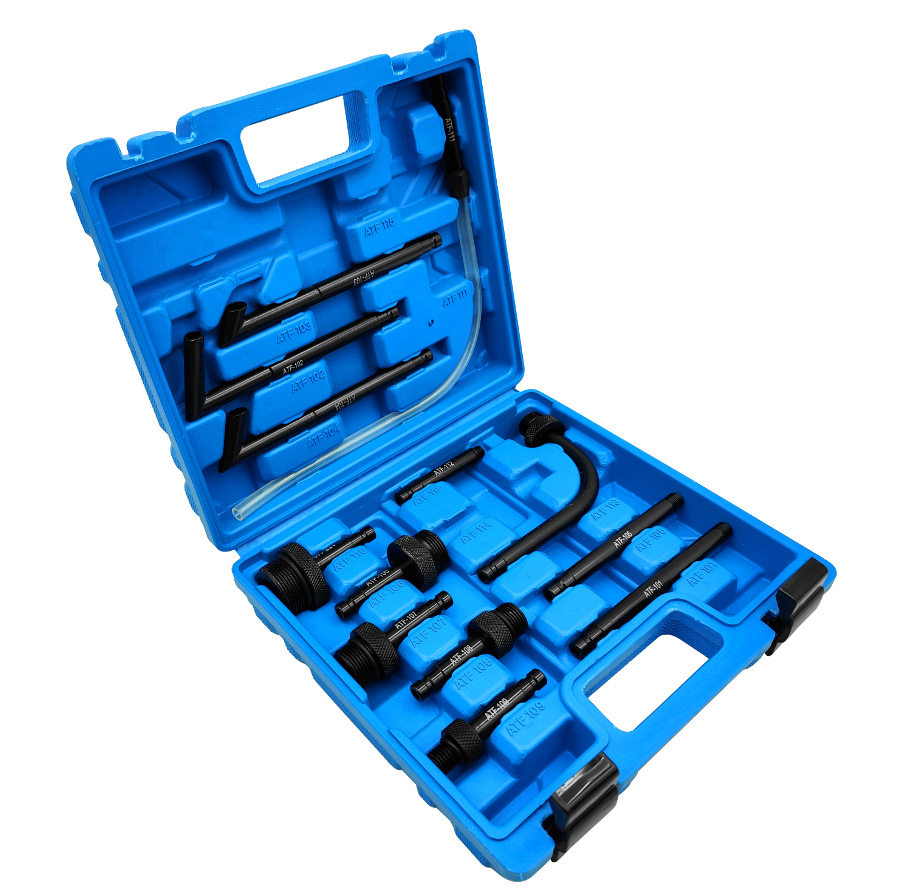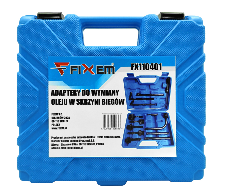 Zestaw 13 szt. adapterów marki FIXEM do wymiany oleju w automatycznych skrzyniach biegów. Adaptery pasują do większości samochodów na rynku. Prezentowany przez nas zestaw jest uniwersalnym kompletem niezbędnym w każdym warsztacie. Wygodna walizka do przechowywania w bezpiecznych warunkach.