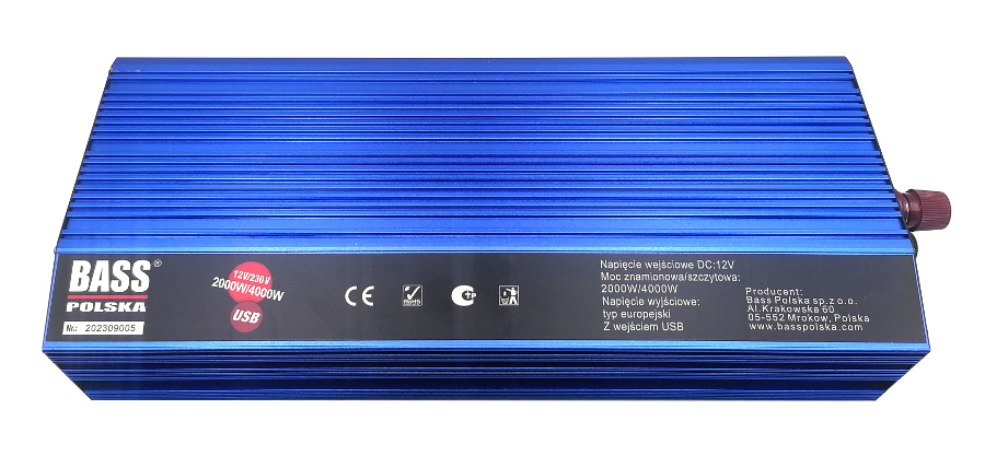 Samochodowa przetwornica napięcia Bass Polska umożliwia korzystanie z urządzeń elektrycznych w dowolnej lokalizacji. Przetwornica przetwarza prąd stały 12 V w prąd zmienny 230 V. Okaże się bardzo przydatnym urządzeniem w przypadku braku możliwości skorzystania z sieci ogólnodostępnej 230 V. Specyfikacjia ✅ Dane techniczne :