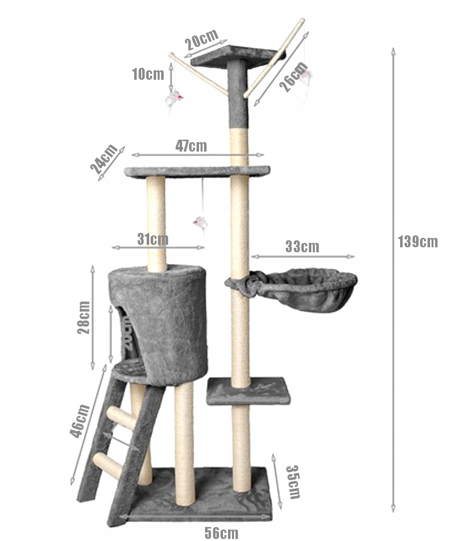 Piętrowy drapak Bass Polska oferuje tak wiele atrakcji, że każdy kot, niezależnie od temperamentu i charakteru, znajdzie tu coś dla siebie. Ruchliwe, młode i pełne życia koty mogą wspinać się do woli i ćwiczyć skoki z trzech stabilnych platform. Wiszące zabawki to akcesoria, które zachwycą zarówno ruchliwe kocięta, jak i te spokojne. Drapak dba o pazury, rozciąga mięśnie i daje ujście dla kociego instynktu. ✅ W ZESTAWIE Czy Twój kot niszczy meble? Drapie kanapy i fotele? Wysoki drapak z legowiskiem będzie rozwiązaniem tego problemu. Kot wyostrzy pazury na drapaku, a Twoje meble pozostaną nienaruszone. Słupki są wprost stworzone do drapania i ścierania kocich pazurków.