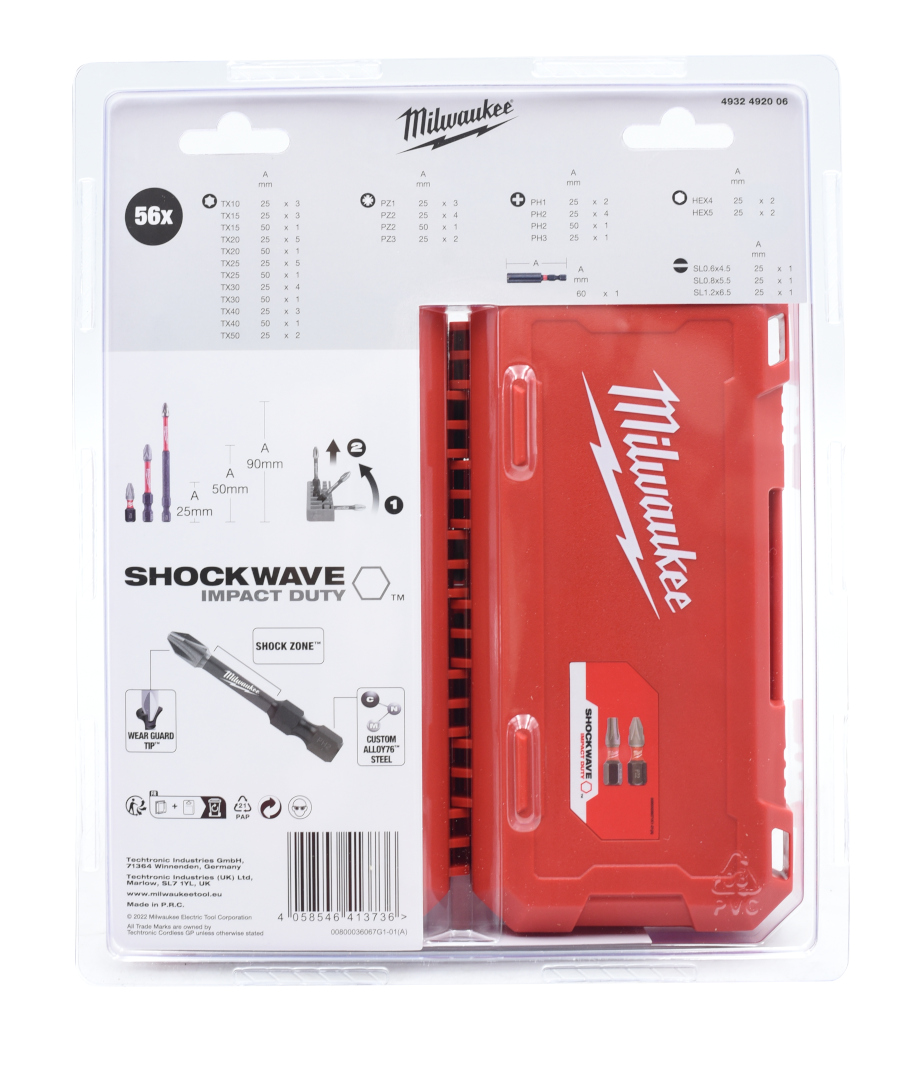 Zestaw bitów udarowych Shockwave Impact Duty Milwaukee zawiera 56 bitów o wysokiej wydajności do użytku z narzędziami udarowymi. Idealny dla rzemieślników i entuzjastów majsterkowania, którzy muszą poradzić sobie z wierceniem i mocowaniem. Bity zawarte w tym zestawie wykonane są z bardzo wytrzymałego matriału, co zapewnia im większą trwałość i wytrzymałość. Dzięki unikalnej konstrukcji bitów wkrętakowych posiadają one geometrię SHOCK ZONE, która umożliwia wyginanie się bitów bez ich łamania. Konstrukcja strefy uderzenia, a także specjalna obróbka cieplna każdego bitu podczas produkcji, czyni je bardziej odpornymi na uszkodzenia udarowe. ❗ Bity udarowe SHOCKWAVE™ ❗ ➜ 48 bitów udarowych SHOCKWAVE™ o długości 25mm: ➜ 7 bitów udarowych SHOCKWAVE™ o długości 50mm: ➜ 1 magnetyczny uchwyt bitów SHOCKWAVE™ 60mm długości》》》 ZESTAW BITÓW UDAROWYCH 56szt. BITY MILWAUKEE ® SHOCKWAVE 4932492006 《《《