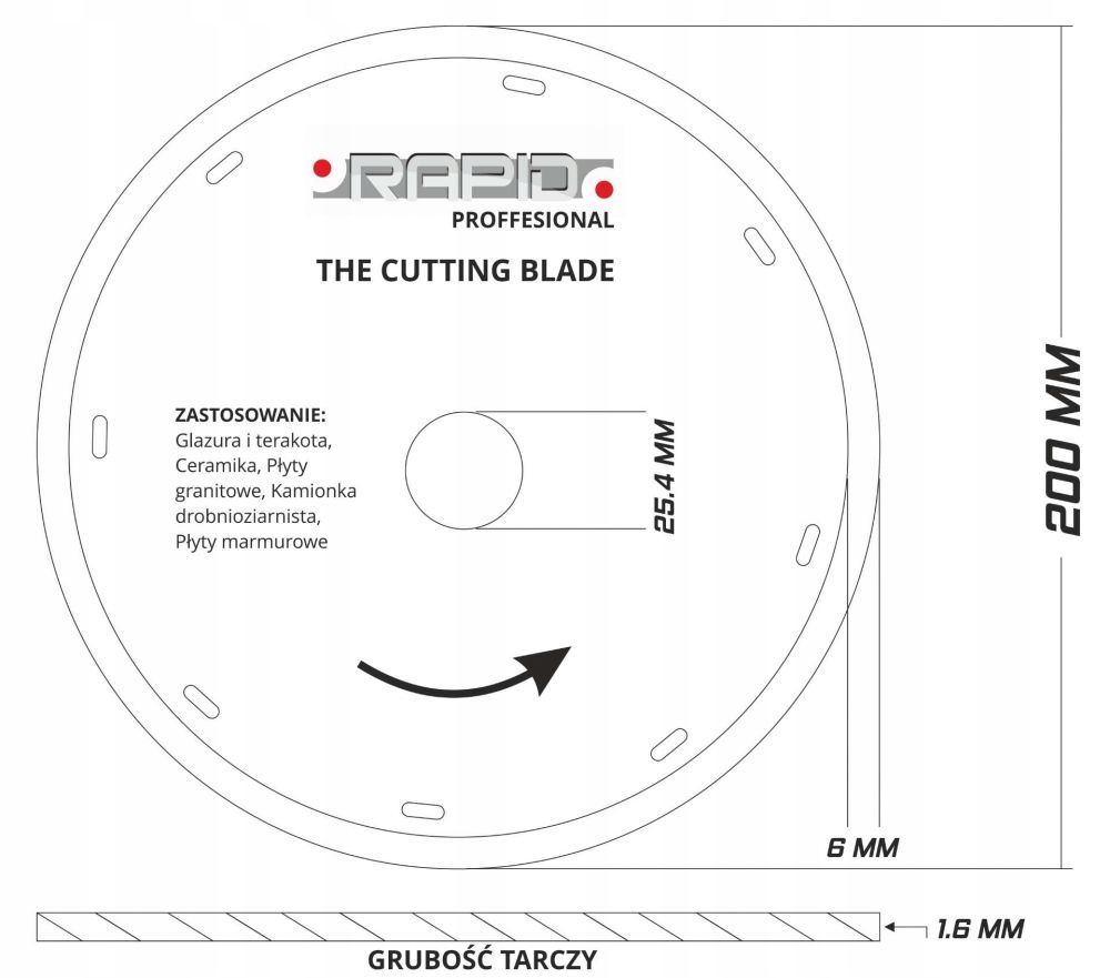 TARCZA DIAMENTOWA 180x1,6x25,4 RAPID BLUE M08715 Tarcza diamentowa do obróbki materiałów budowlanych (beton, cegła, kostka brukowa, klinkier, gazobeton, płytki ceramiczne) najwyższej jakości. Standardowo pasuje do szlifierek kątowych i maszyn tnących. Zapewniona dłuższa żywotność i szybsza praca dzięki nowej technologii produkcji. Charakterystyka: Zastosowanie: Tarcza diamentowa przeznaczona do cięcia ceramiki, betonu, gresu, kamienia, marmuru, klinkieru, cegły, piaskowca. (przy twardych materiałach należy używać chłodzenia) DANE TECHNICZNE: