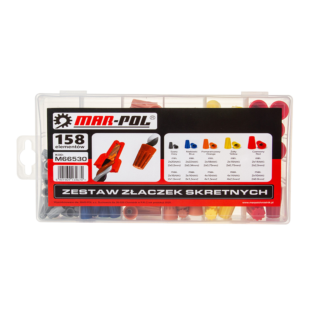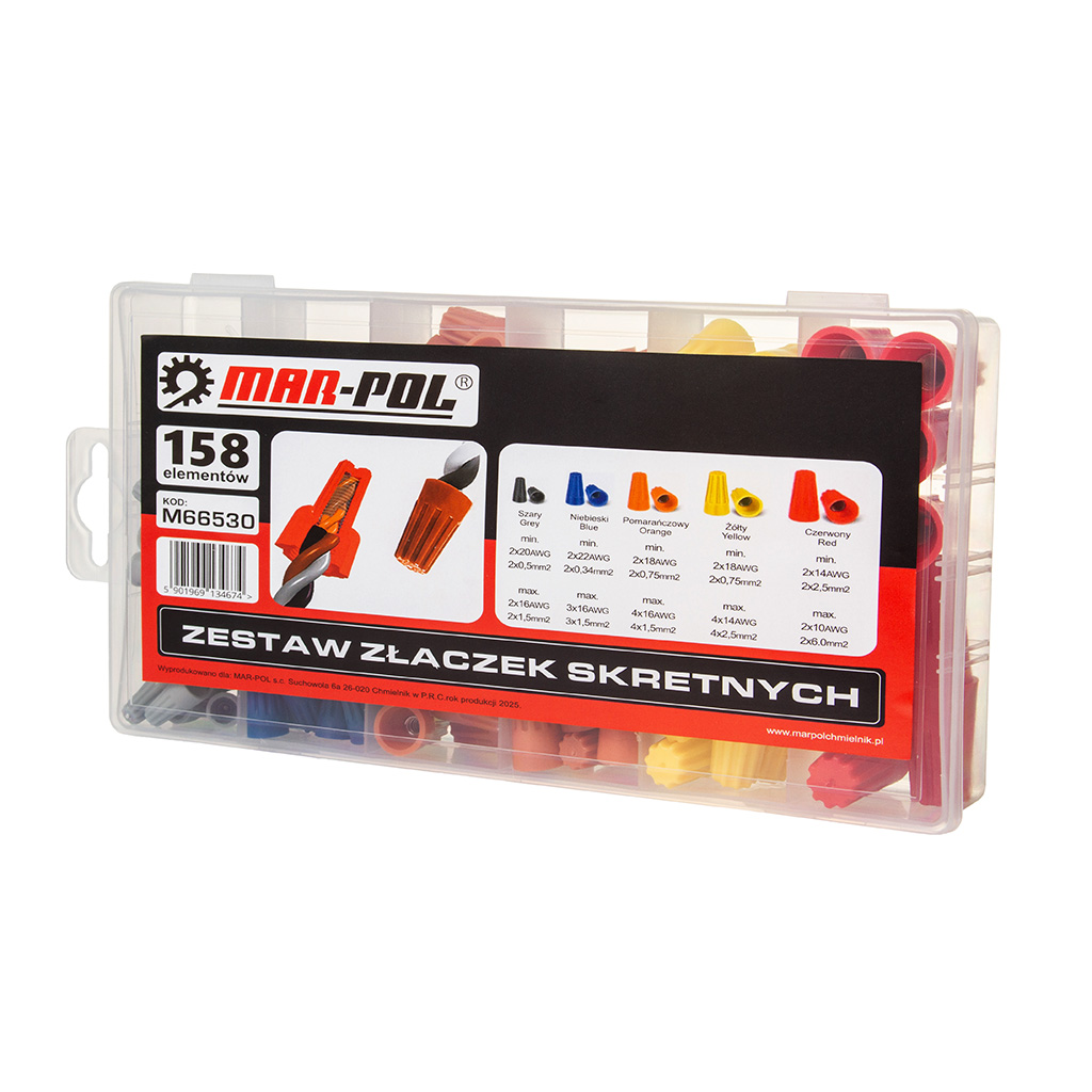 Złączka skrętna pozwala na łączenie przewodów o dużej rozpiętości przekrojów znamionowych. Można w niej łączyć przewody.》》》 ZESTAW ZŁĄCZEK KABLOWYCH SKRĘTNYCH DO PRZEWODÓW 158el M66530 《《《