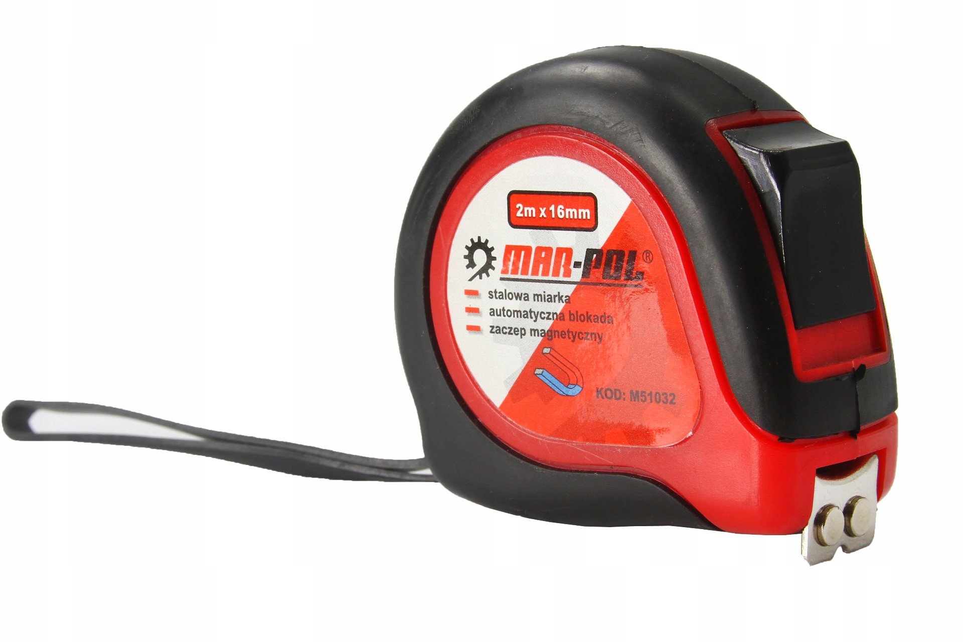 STALOWA TAŚMA MIERNICZA 2m x 16mm Taśma miernicza z blokadą, stalową miarką i uchwytem magnetycznym. Ergonomiczna obudowa, wygodna dla dłoni. Duża i bardzo dobrze widoczna podziałka. Miarka posiada zaczep magnetyczny. Automatyczna blokada. Taśma miernicza wyposażona w przycisk stop umożliwiający zablokowanie taśmy w dowolnym momencie. Pasek i praktyczny zaczep na odwrocie, umożliwiający np. zaczepienie taśmy mierniczej przy spodniach. Taśma miernicza wyposażona w uniwersalną zawieszkę