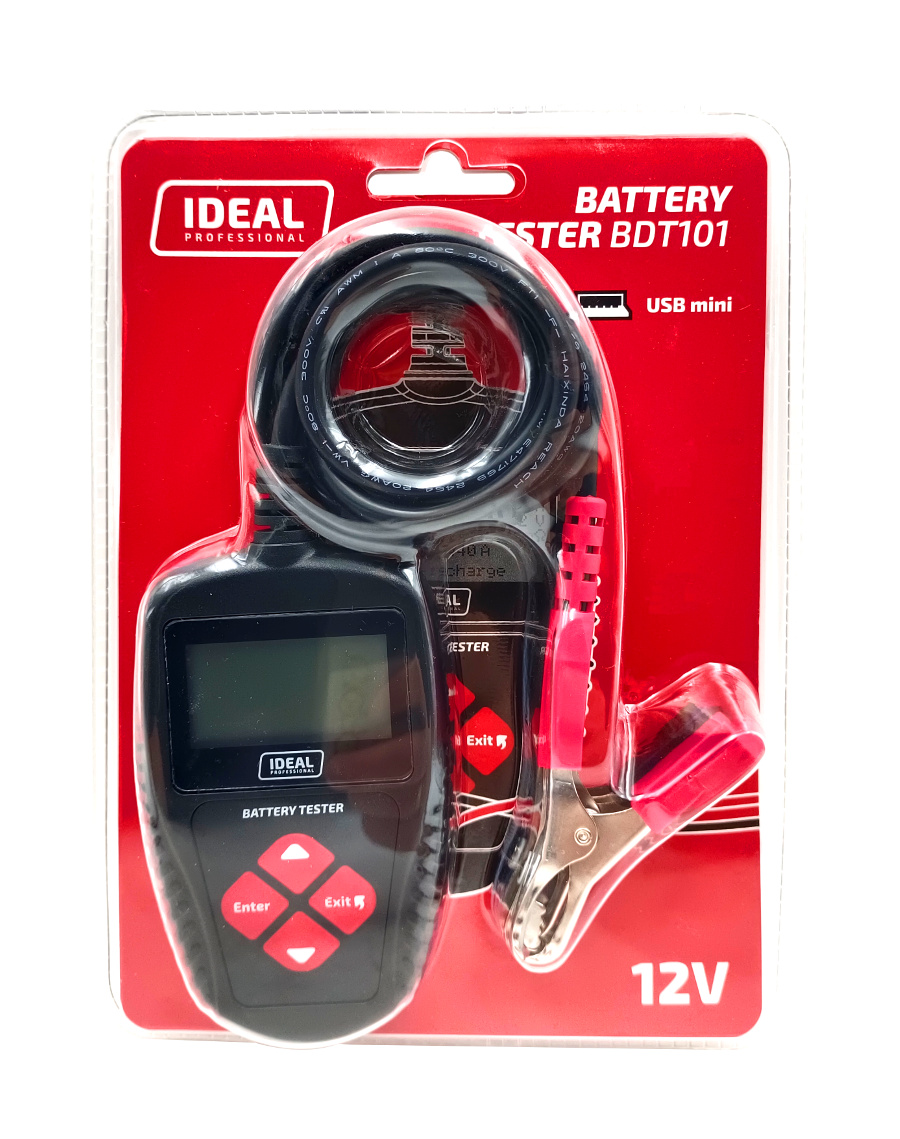 Tester akumulatora i instalacji BDT101 12V z wyświetlaczem przeznaczony jest dla akumulatorów kwasowych płynnych WET, żelowych, AGM, EFB. Korzystając z testera mamy możliwość wyboru 10 standardów akumulatora: EN, JIS, DIN, IEC, SAE, CCA, BCI, CA, MCA oraz GB. Wbudowane złącze USB mini umożliwia połaczenie testera z komputerem i wydruk odczytanych parametrów. Tester posiada 6 języków do obsługi : Polski, Włoski, Hiszpański, Niemiecki, Francuski oraz Angielski Tester włącza się automatycznie, po prawidłowym podpięciu zacisków do akumulatora. Najniższe i najwyższe wartości prądu rozruchu (CCA), które można testować: