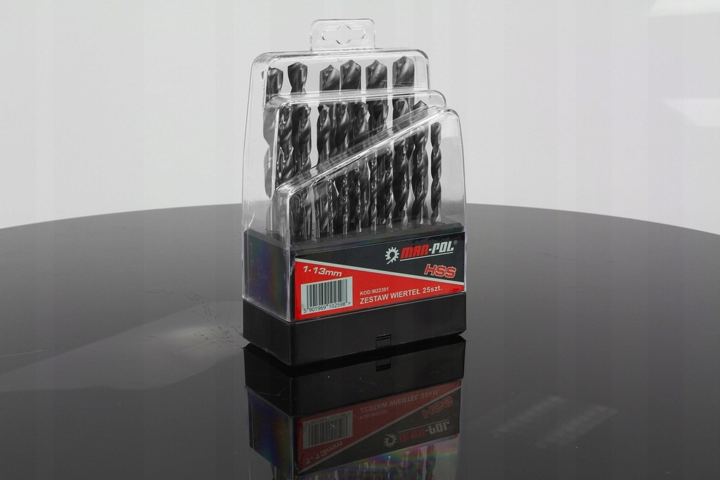 Wiertła HSS firmy MAR-POL charakteryzują się wysoką elastycznością, uzyskaną w wyniku odpowiedniej obróbki cieplnej. Co znacząco zmniejsza ryzyko na złamanie wiertła. Rowek wiórowy pokryty jest warstwą tlenku, która zapewnia szybsze odprowadzenie wiórów. Wygodne i praktyczne pudełko z plastikowym domknięciem eleganckie pudełko
