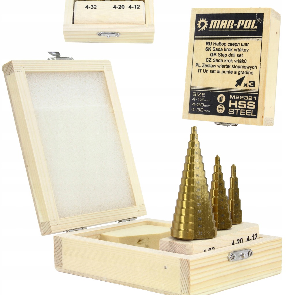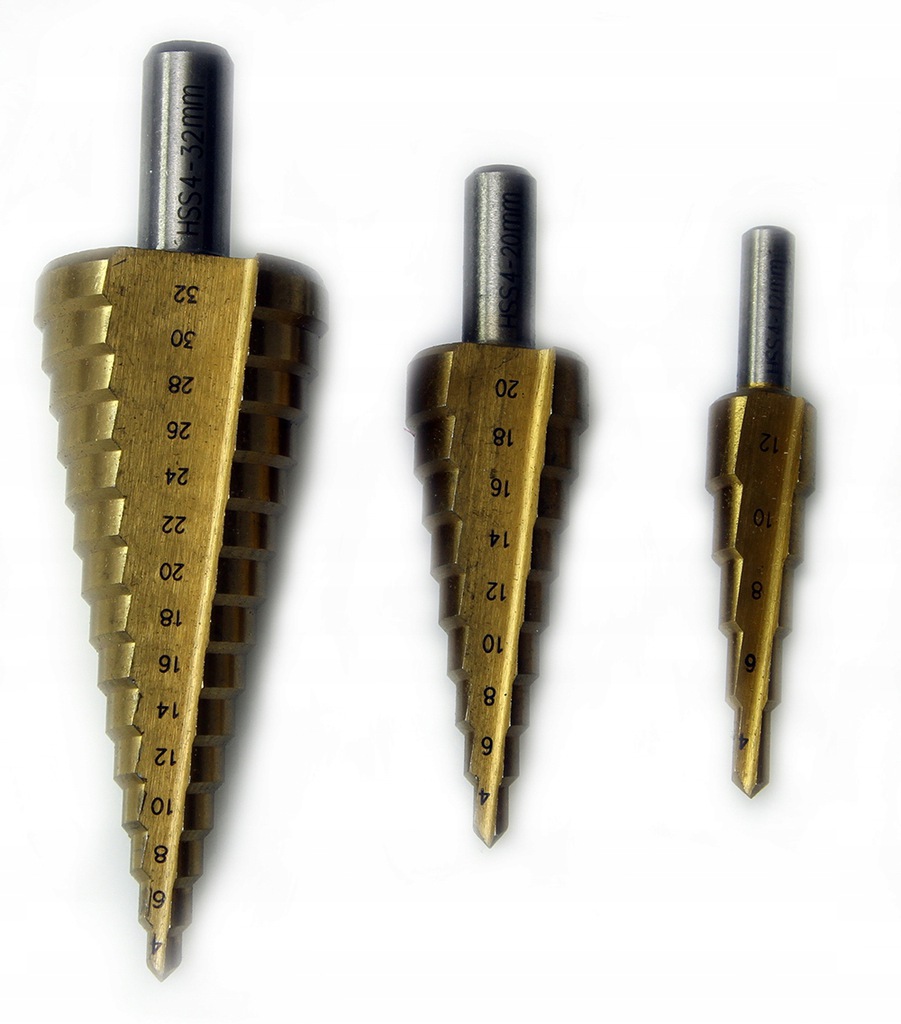 Szlifowane wiertła ze stali szybkotnącej (HSS) pokryte powłoką z tytanu co przedłuża ich żywotność sześciokrotnie w porównaniu z normalnymi wiertłami HSS. Wiertła wiercą najcieńsze blachy bez uprzedniego nawiercania, bez zadziorów, bez przywierania wiórów do wiertła. Głównie do obróbki metali nieżelaznych, blach stalowych cienkościennych i tworzyw sztucznych. Każde wiertło ma naniesioną numerację co znacznie ułatwia kontrolowanie wielkości otworu podczas wiercenia. Wiertła są wyposażone w uchwyt cylindryczny. Zestaw znajduje zastosowanie w blacharstwie, ślusarstwie, branży instalatorskiej itp. Dane Techniczne: 1x wiertło: 4 - 6 - 8 - 10 - 12 mm 1x wiertło: 4 - 6 - 8 - 10 - 12 - 14 - 16 - 18 - 20 mm 1x wiertło: 4 - 6 - 8 - 10 - 12 - 14 - 16 - 18 - 20 - 22 - 24 - 26 - 28 - 30 -32 mmWIERTŁA STOPNIOWE ZESTAW 3EL HSS 4-12mm, 4-20mm, 4-32mm M22321