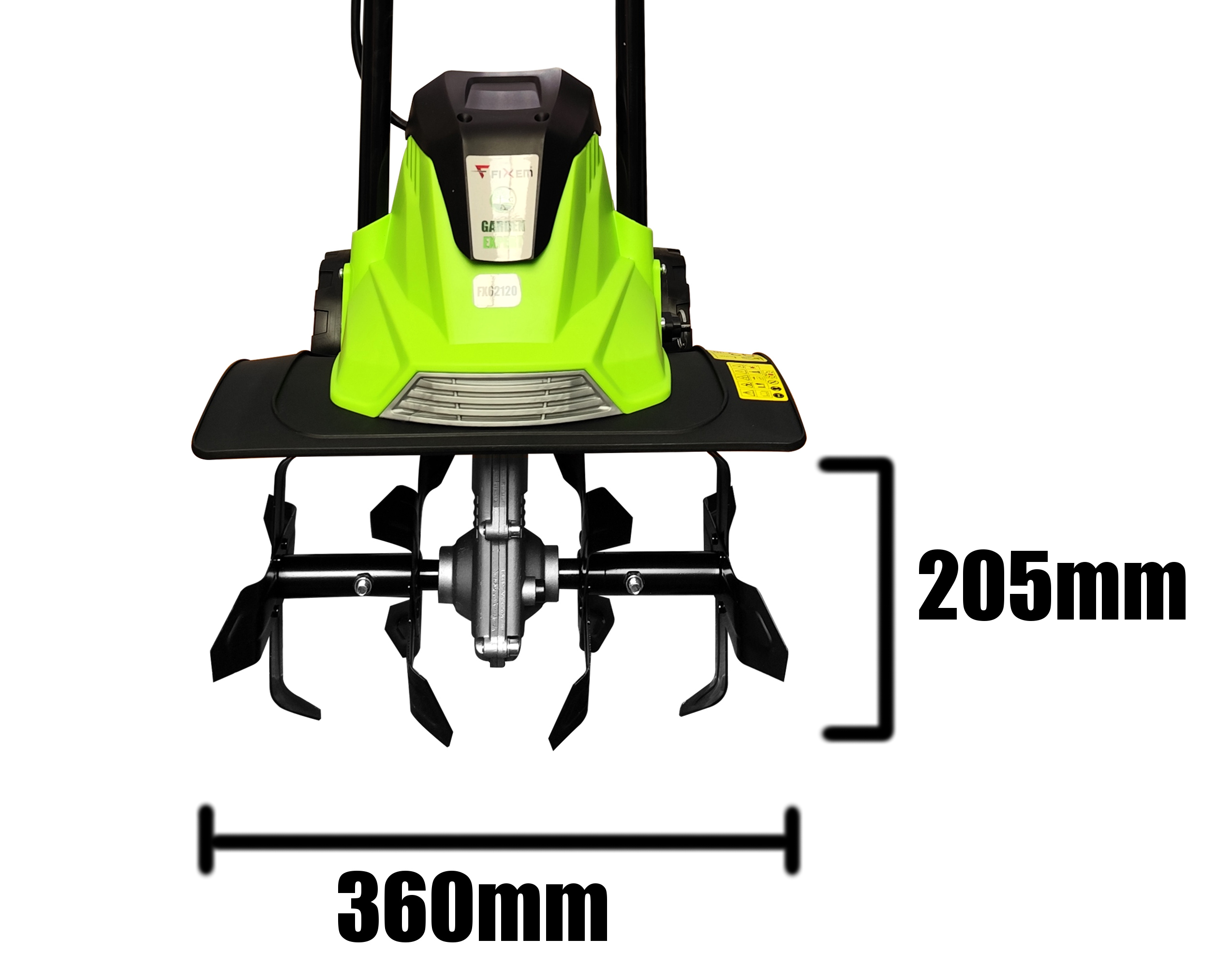 Glebogryzarka marki FIXEM dzięki kompaktowej konstrukcji i łatwej obsłudze pozwala szybko przygotować teren pod siew, oszczędzając czas oraz wysiłek. Glebogryzarka jest maszyną przydatną podczas uprawy gleby w ogrodzie i na polu. Sprawdza się podczas spulchniania i wyrównania dużych powierzchni gleby. Doskonale sprawdzi się podczas przygotowywania gleby pod uprawę różnych roślin, prac sezonowych, ułatwi też zakładanie trawnika. ✅ Specyfikacja techniczna: Ergonomiczne rączki ułatwiają sterowanie glebogryzarką, rozstaw rękojeści jest zoptymalizowany pod kątem zapewnienia komfortu podczas pracy. Dodatkowo rękojeść posiada zaczep do zawieszenia przewodu zasilającego. Elektryczny system rozruchu pozwala szybko uruchomić glebogryzarkę bez wysiłku fizycznego. Rozwiązanie jest przyjazne dla użytkownika, zwiększając komfort użytkowania. Glebogryzarka to prawdziwy sprzymierzeniec każdego ogrodnika. Dzięki szerokości roboczej wynoszącej 36 cm szybko i efektywnie spulchnisz nawet większe powierzchnie, oszczędzając czas i wysiłek. Co więcej, głębokość pracy sięgająca aż 22 cm sprawia, że gleba zostaje dokładnie napowietrzona i przygotowana do siewu lub sadzenia roślin. Glebogryzarka elektryczna wyposażona jest w wytrzymałe kółka transportowe , które ułatwiają przemieszczanie urządzenia. Kółka minimalizują wysiłek przy przemieszczaniu, nawet na nierównym terenie. Siła tkwi w ostrzach Cztery solidne, czteroramienne noże zapewniają równomierne i skuteczne rozdrabnianie gleby – nawet tej zbitej lub pełnej resztek roślinnych. Ostre i trwałe elementy tnące gwarantują długą, bezproblemową eksploatację urządzenia. Solidna obudowa gwarantuje wysoką odporność na uszkodzenia mechaniczne oraz długą żywotność urządzenia. Dzięki niej glebogryzarka staje się niezawodną inwestycją na wiele lat.