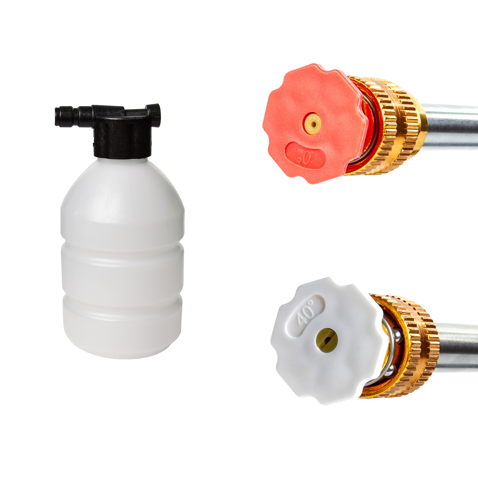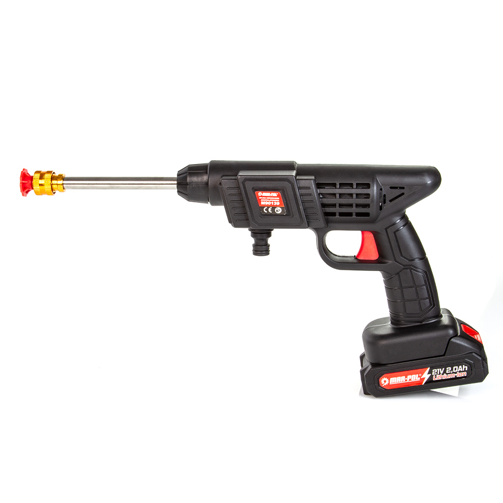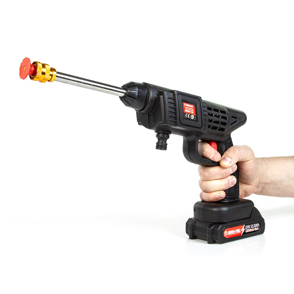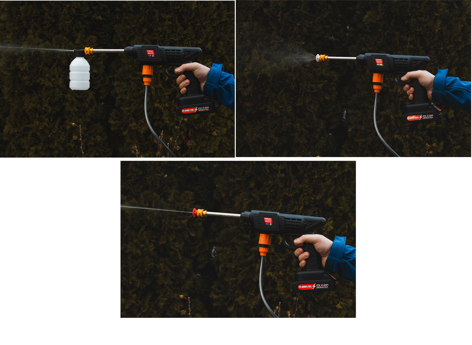 Innowacyjna akumulatorowa myjka ciśnieniowa - idealne narzędzie do czyszczenia w każdym miejscu, bez ograniczeń i uciążliwych przewodów. Ta zaawansowana myjka ciśnieniowa została zaprojektowana, aby dostarczać wyjątkową mobilność i efektywność, spełniając wszystkie Twoje oczekiwania dotyczące czystości. Niezależność od przewodów to jedna z głównych zalet tej myjki ciśnieniowej. Dzięki akumulatorowi, nie musisz już martwić się o długość kabla czy dostęp do gniazdka elektrycznego. Możesz swobodnie przemieszczać się i korzystać z myjki w dowolnym miejscu, zarówno wewnątrz, jak i na zewnątrz budynków. Czy to czyszczenie samochodu, tarasu, mebli ogrodowych czy oczyszczanie podjazdu - ta myjka jest gotowa do działania. Myjka wyposażona jest w dwie dysze oraz pianownicę. ➜ Tryb prysznica (dysza 40°): szerszy zakres czyszczenia, podlewanie roślin, piana spłukująca. ➜ Tryb wysokiego ciśnienia (dysza 0°): Strumień wody pod wysokim ciśnieniem spłukuje uporczywe plamy. ➜ Tryb piany: Zapewniamy również zbiornik na pianę o pojemności 200 ml, piana jest szybka, delikatna i równomierna, odpowiednia do mycia samochodu lub czyszczenia okien.