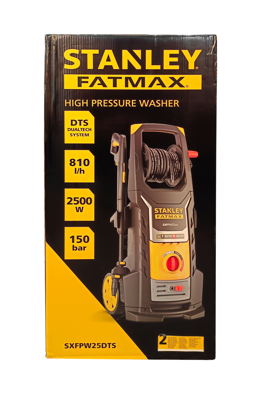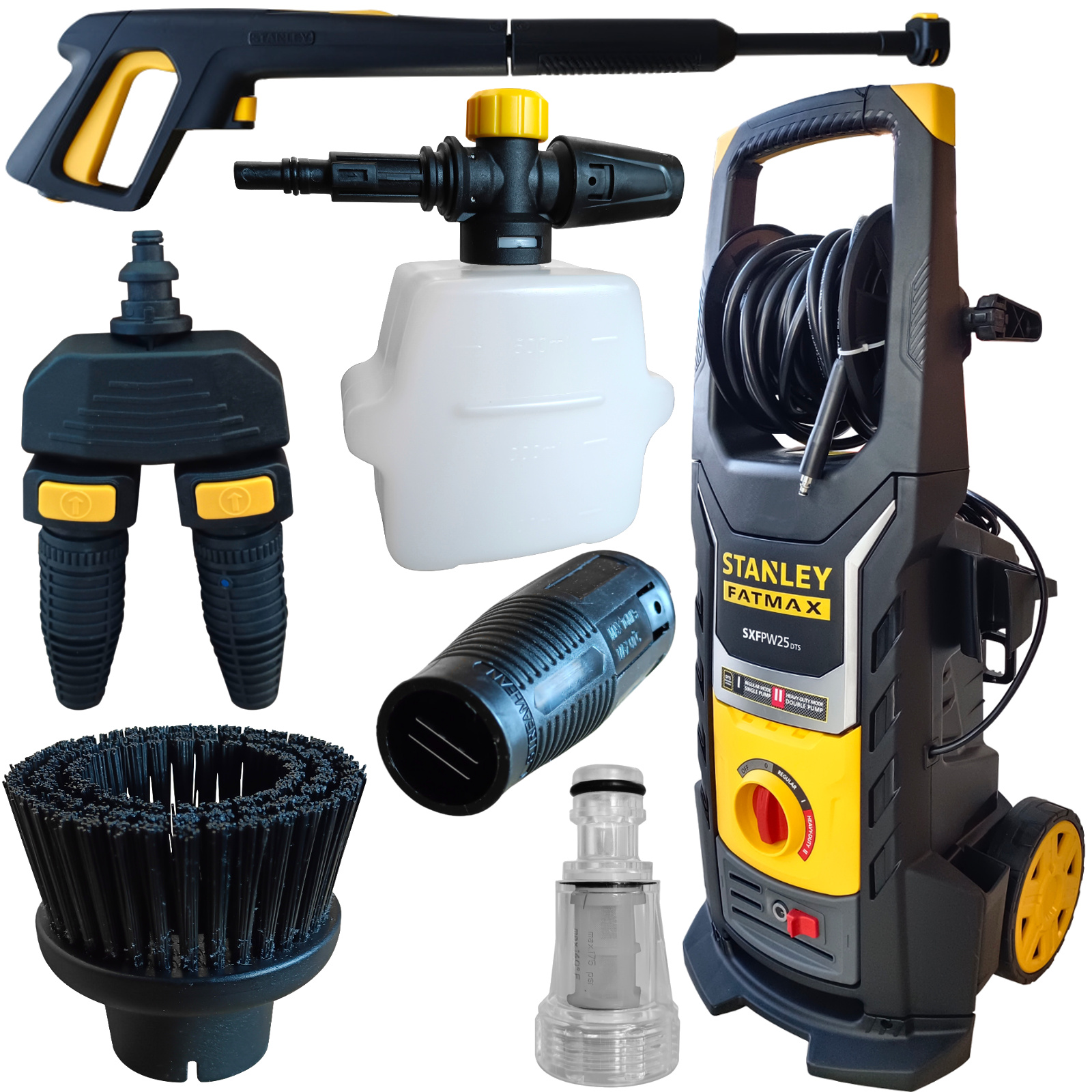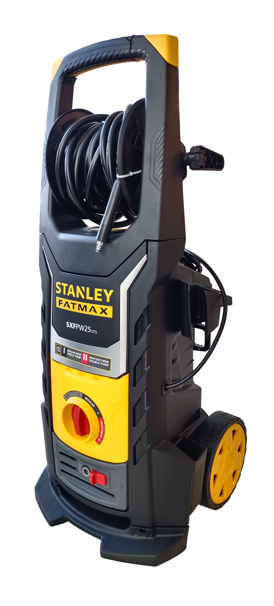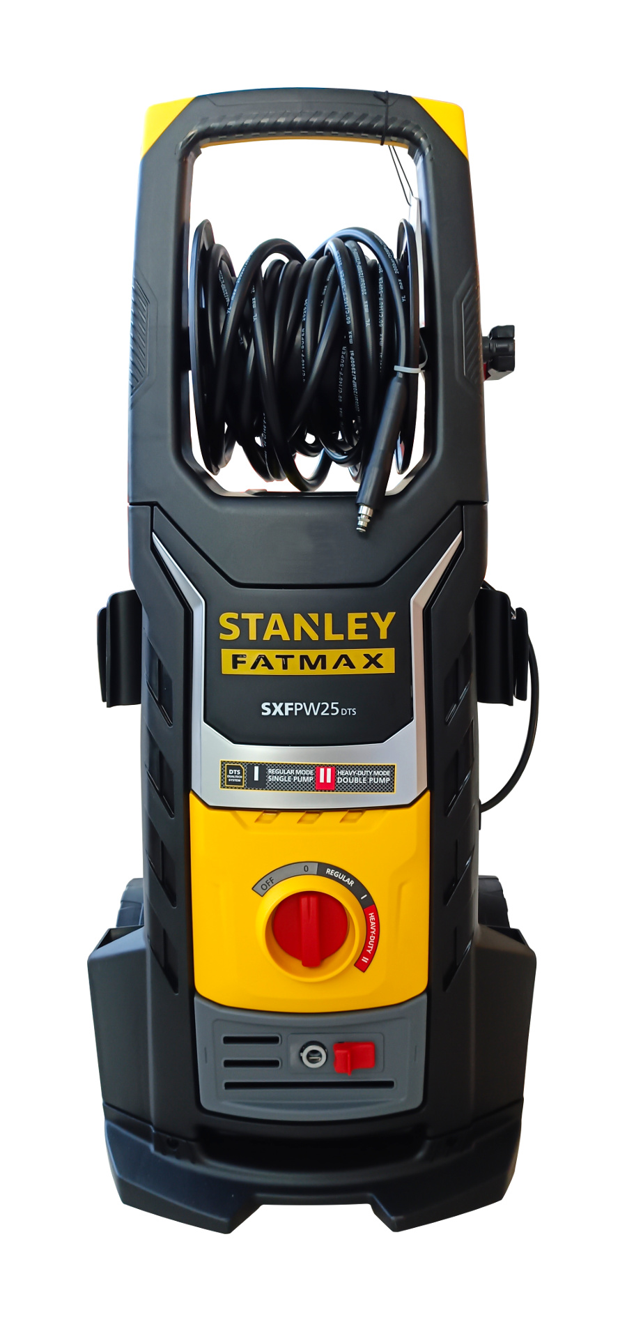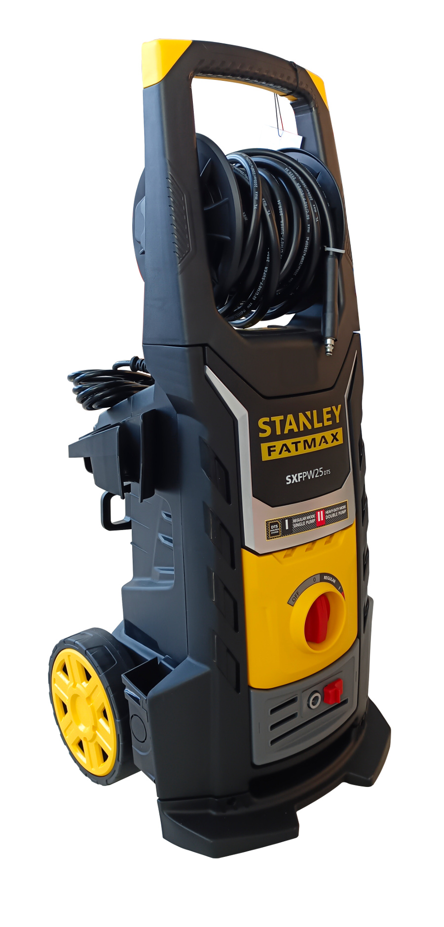 Myjka wysokociśnieniowa STANLEY FATMAX® SXFPW25DTS-E to myjka półprofesjonalna z technologią DUALTECH umożliwiającą podwójną moc zapewniającą przepływ do 810l/h. SXFPW25DTS-E ma silnik o mocy 2500W i wytwarza maksymalne ciśnienie 150 barów. Pompa wyposażona jest w zabezpieczenie termiczne i zawór bezpieczeństwa do automatycznego resetowania ciśnienia. Natomiast program Heavy-Duty pozwala na usunięcie nawet najbardziej uporczywych zanieczyszczeń z powierzchni takich jak beton, kamień i sprzęt budowlany. DTS to innowacyjny system technologiczny umożliwiający modułową pracę myjki ciśnieniowej poprzez wykorzystanie dwóch pomp silnikowych. Dzięki systemowi DTS wydajność jest znacznie zwiększona w porównaniu do zwykłych myjek ciśnieniowych. W przypadku modelu SXPW25DTS-E możesz wybierać pomiędzy: