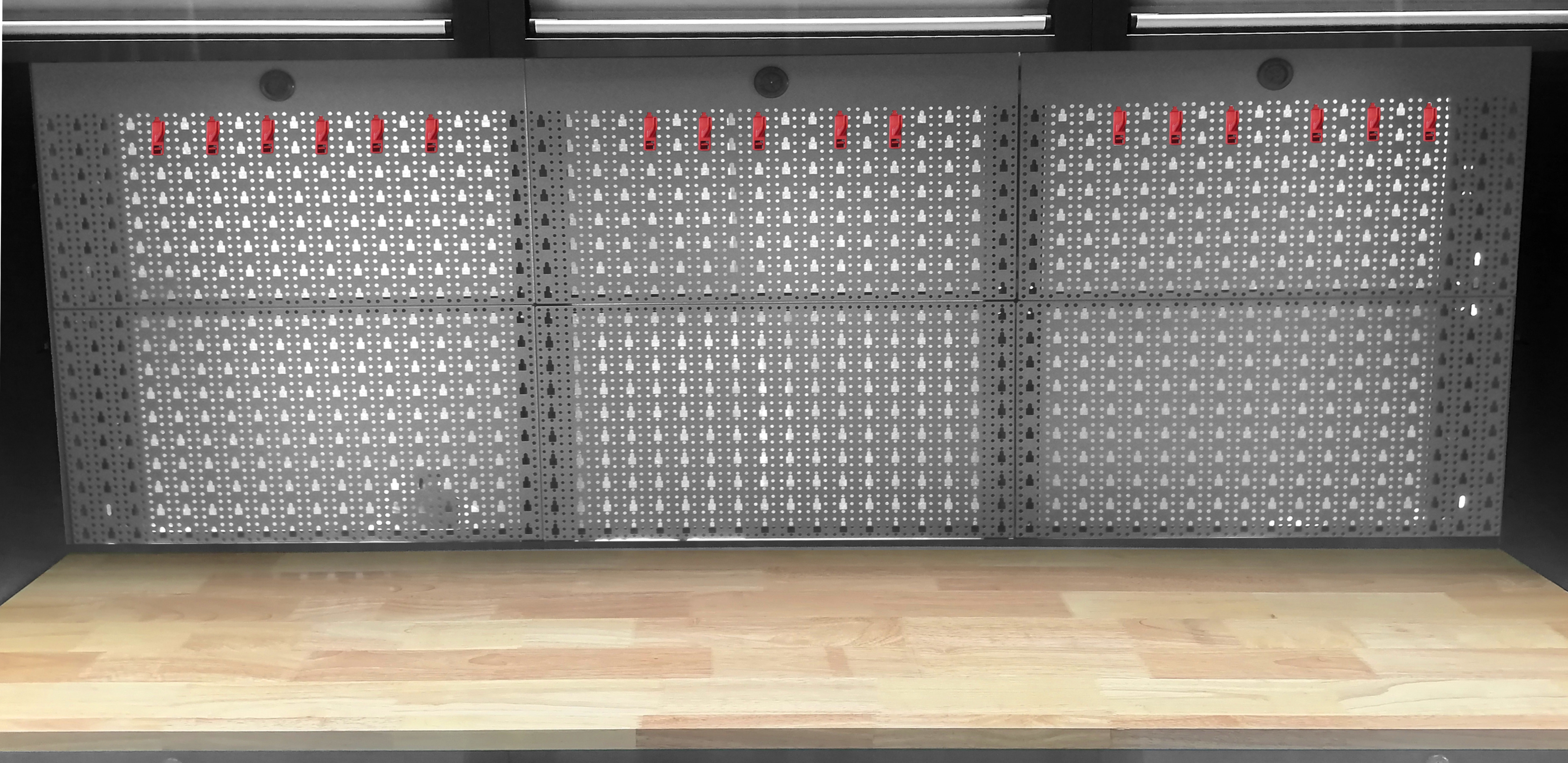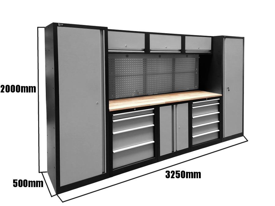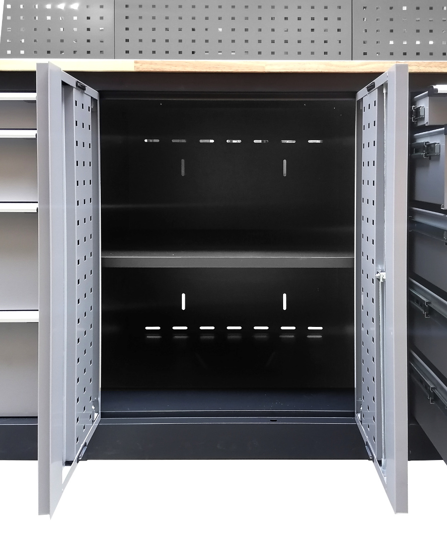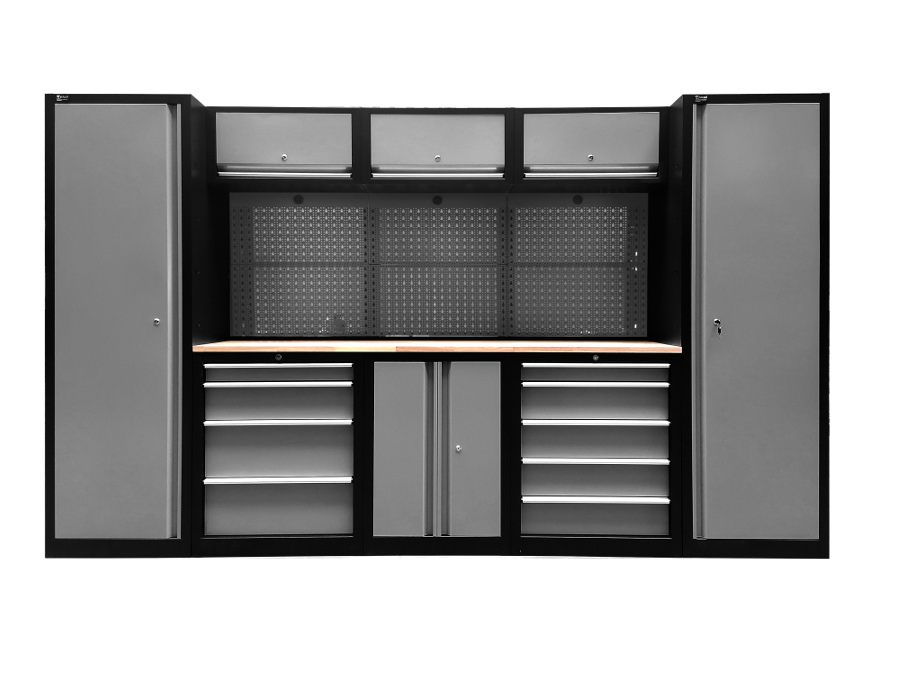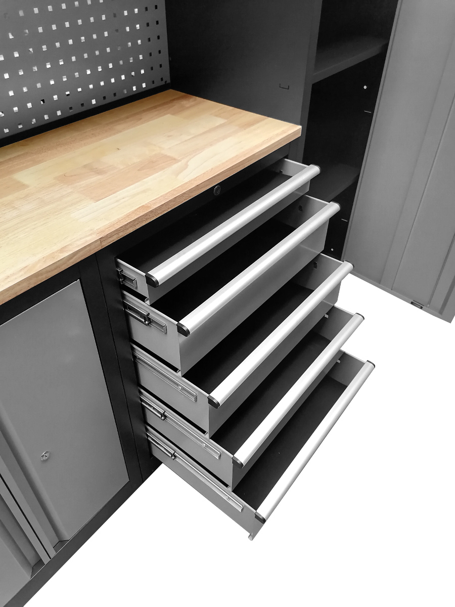 Profesjonalny regał warsztatowy wykonany ze stali malowanej proszkowo, wykończony twardym drewnianym blatem roboczym. Szafa w kolorze szaro-czarnym, łatwa w utrzymaniu czystości, szuflady na solidnych prowadnicach, wszystkie skrzydła zamykane na klucz, szuflady z zamkiem centralnym na kluczyk. ✅ Wymiary: Obie zewnętrzne, pionowe szafki posiadają po 4 półki, które można zamocować w różnych (osiemnastu ) pozycjach. Regał posiada dwie zamykane szafki z szufladami na prowadnicach. Szafka z lewej strony posiada 4 szuflady o wymiarach wewnętrznych 57x39,5cm Szafka z lewej strony posiada 5 szuflad o wymiarach wewnętrznych 57x39,5cm Pomiędzy szafkami z szufladami znadują się półka o wymiarach 680x430mm. Drewniany blat roboczy o wymiarach 2055x435mm i grubości 30mm znajduję się na wysokości 895mm od ziemi. W zestawie znajduje się 20 haczyków, dzięki którym możemy powiesić nasze narzędzia na kratce znajdującej się nad blatem. Trzy wiszące szafki wyposażone w siłowniki zapewniaja wygodę i komfort pracy. ✅ Wymiary wewnętrzne półek : Niezwykle przydatny taboret do warsztatu , jest niezwykle wygodny i mobilny - dzięki możliwości obrotu siedziska o 360 stopni.