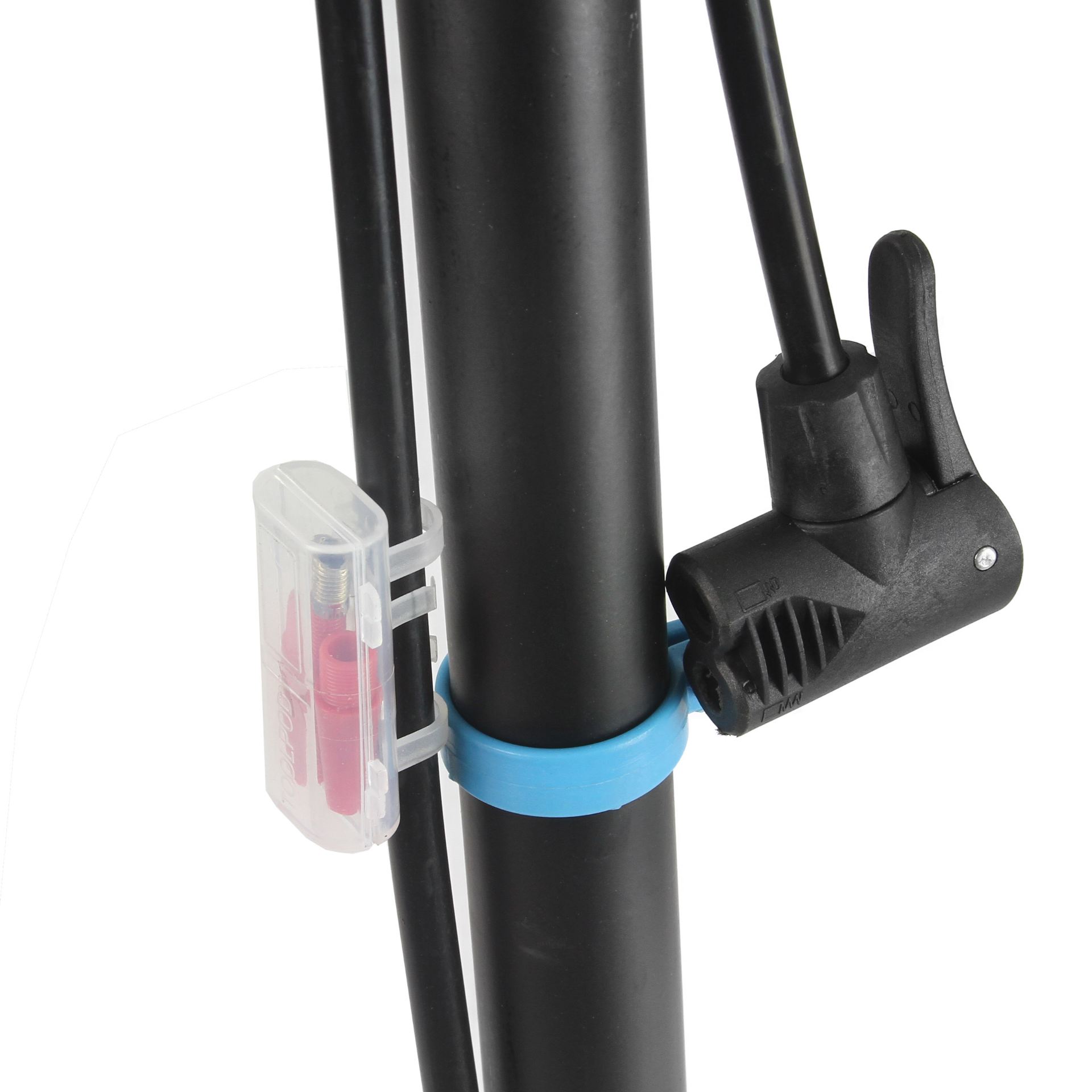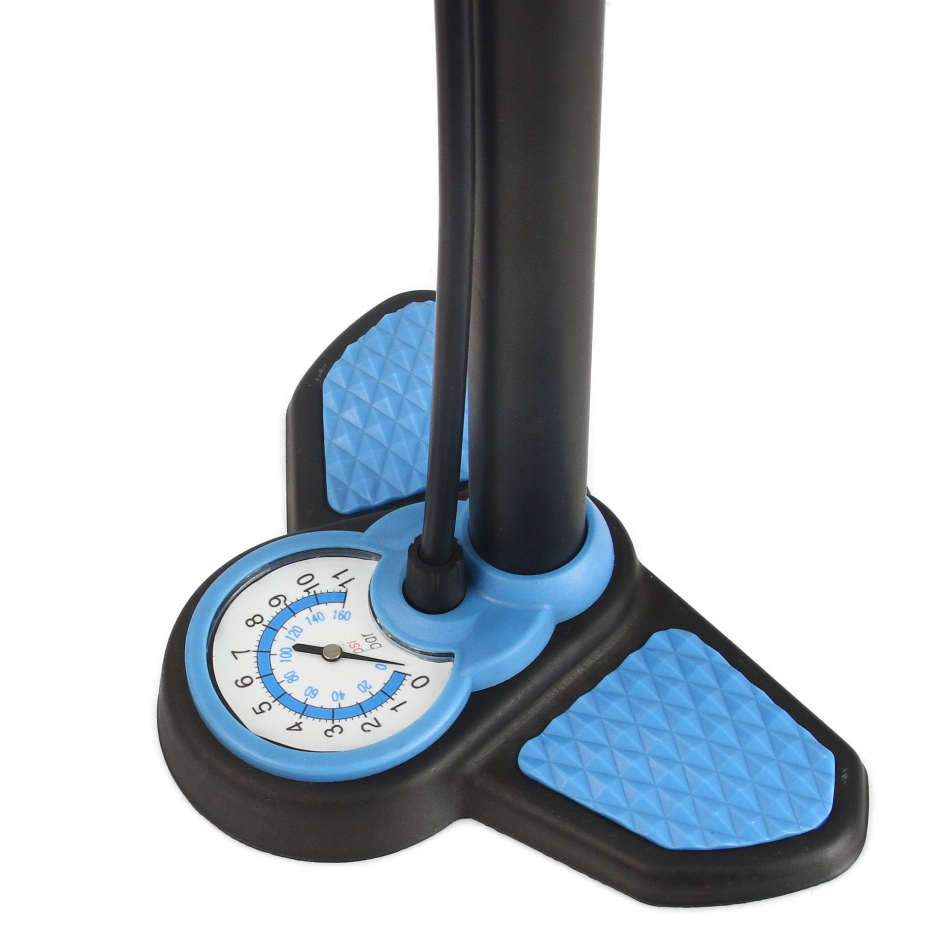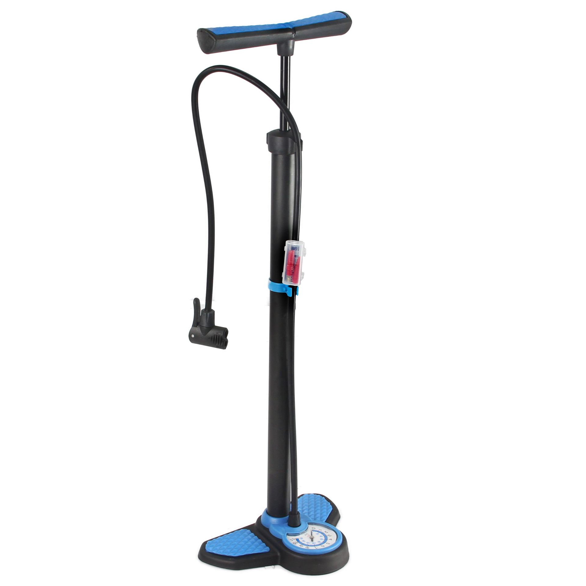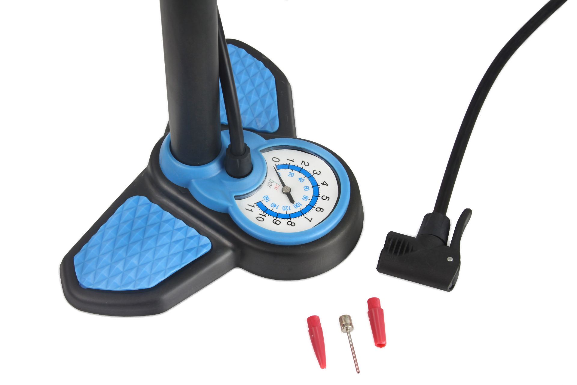 Pompka słupkowa ręczna. Przeznaczona do pompowania samochodów, rowerów, sprzętu sportowego i turystycznego. Rączka wykończona gumowym materiałem. Stabilna podstawa. Manometr 10 bar Zestaw końcówek Wysokość: ok 70 cm Długość wężyka ok. 100 cm