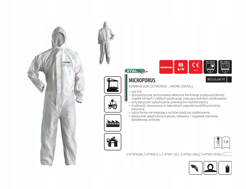 Microporus typ 5/6 super lekki specjalistyczna, laminowana włóknina podnosi znacząco komfort użytkowania antystatyczne wykończenie możliwość stosowania w warunkach zagrożenia elektrycznością statyczną luźna forma, nie krępująca ruchów podczas użytkowania Kombinezon ochronny znajdzie idealne zastosowanie:STALCO PREMIUM