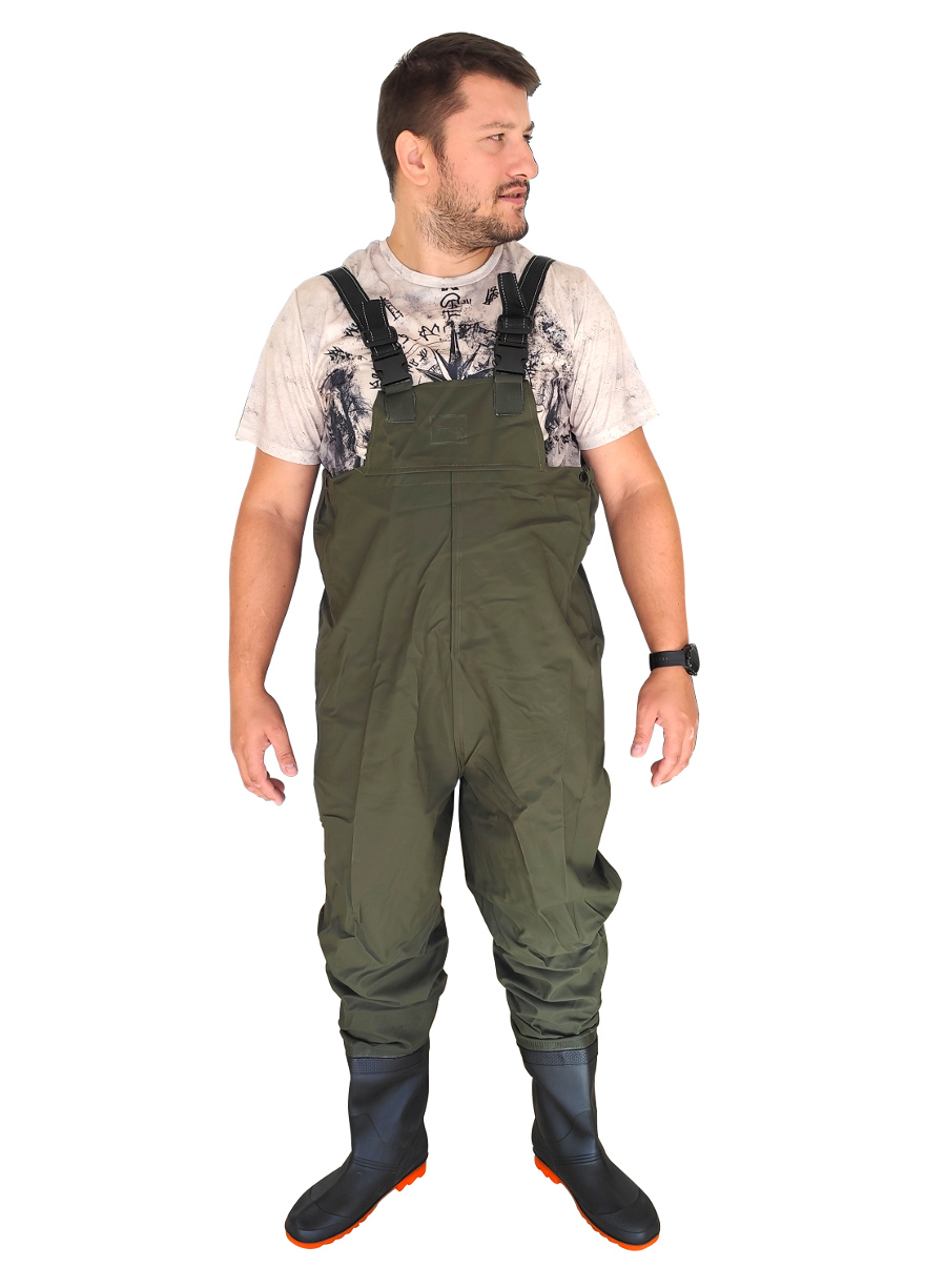 Profesjonalne wodery z wbudowanymi kaloszami i szerokimi, regulowanymi szelkami to niezbędne wyposażenie dla każdego, kto ceni sobie suchą odzież i wygodę w trudnym terenie. Sprawdzą się doskonale podczas wędkowania, pracy w gospodarstwie, przy czyszczeniu stawów, a także w każdej sytuacji wymagającej pełnej ochrony przed wilgocią i błotem. Gumowe kalosze z bieżnikiem zapewniają świetną przyczepność na mokrych, błotnistych i kamienistych powierzchniach. Buty są wtopione w materiał, dzięki czemu tworzą szczelne i trwałe połączenie – idealne do brodzenia w trudnym terenie. Na froncie woderów, od wewnątrz znajduje się praktyczna kieszeń, która pozwala przechowywać najpotrzebniejsze rzeczy – takie jak klucze, dokumenty, zapalniczkę, przynęty czy telefon. ROZMIAR 43: A=27 cm | B=26 cm | C=55 cm | D=28 cm | E=62 cm | F=86 cm | wewnętrzna wkładka 26 cm ROZMIAR 44: A=27,5 cm | B=26 c m | C=56 cm | D=28 cm | E=59cm | F=90 cm | wewnętrzna wkładka 26,5 cm ROZMIAR 45: A=28 cm | B=26 cm | C=56 cm | D=28 cm | E=60 cm | F=91 cm | wewnętrzna wkładka 27 cm ROZMIAR 46: A=28 cm | B=27 cm | C=56 cm | D=29 cm | E=58 cm | F=95 cm | wewnętrzna wkładka 27 cm