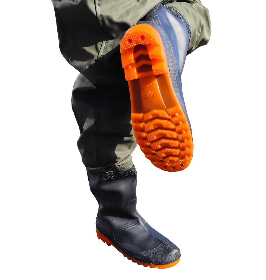 Profesjonalne wodery z wbudowanymi kaloszami i szerokimi, regulowanymi szelkami to niezbędne wyposażenie dla każdego, kto ceni sobie suchą odzież i wygodę w trudnym terenie. Sprawdzą się doskonale podczas wędkowania, pracy w gospodarstwie, przy czyszczeniu stawów, a także w każdej sytuacji wymagającej pełnej ochrony przed wilgocią i błotem. Gumowe kalosze z bieżnikiem zapewniają świetną przyczepność na mokrych, błotnistych i kamienistych powierzchniach. Buty są wtopione w materiał, dzięki czemu tworzą szczelne i trwałe połączenie – idealne do brodzenia w trudnym terenie. Na froncie woderów, od wewnątrz znajduje się praktyczna kieszeń, która pozwala przechowywać najpotrzebniejsze rzeczy – takie jak klucze, dokumenty, zapalniczkę, przynęty czy telefon. ROZMIAR 43: A=27 cm | B=26 cm | C=55 cm | D=28 cm | E=62 cm | F=86 cm | wewnętrzna wkładka 26 cm ROZMIAR 44: A=27,5 cm | B=26 c m | C=56 cm | D=28 cm | E=59cm | F=90 cm | wewnętrzna wkładka 26,5 cm ROZMIAR 45: A=28 cm | B=26 cm | C=56 cm | D=28 cm | E=60 cm | F=91 cm | wewnętrzna wkładka 27 cm ROZMIAR 46: A=28 cm | B=27 cm | C=56 cm | D=29 cm | E=58 cm | F=95 cm | wewnętrzna wkładka 27 cm