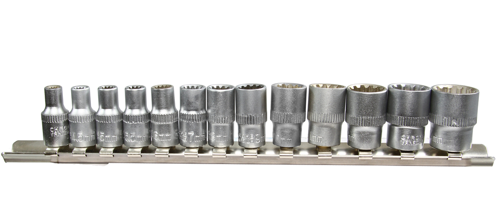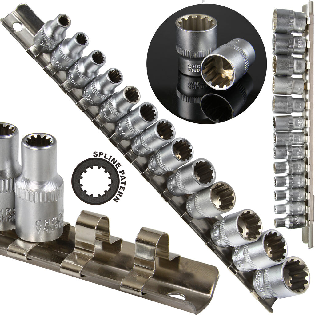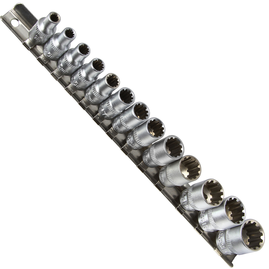 Profesjonalny zestaw nasadek wewnętrznych SPLINE Zestaw zawiera 12-kątne nasadki w najbardziej popularnych rozmiarach od 4mm do 14mm. Zaczepione na praktycznej szynie , którą można sobie powiesić na ścianie ✅ Nasadki w rozmiarach : Wykonane zostały z wysokiej jakości stali chromowo-wanadowej (CrV). Sferyczny kształt nasadek sprawia, że całość ma bardzo szerokie zastosowanie, umożliwiając odkręcanie śrub : SPECYFIKACJA