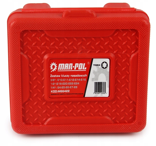 M66422 Komplet nasadek E-TORX na 1/2", 3/8" i 1/4” Zestaw jest starannie i precyzyjnie wykonany z wysoce wytrzymałej stali chromowo-wanadowej (CrV), co znacznie zwiększa ich trwałość i żywotność. Zestaw przydatny w każdym profesjonalnym warsztacie samochodowym, jak i w przydomowym garażu. Całość zapakowana w poręczną i solidną plastikową walizkę. ZESTAW ZAWIERA:
