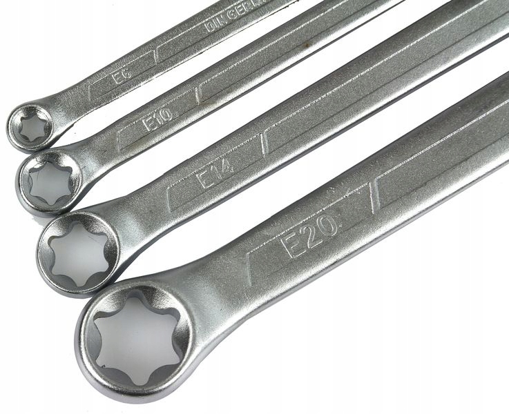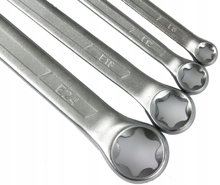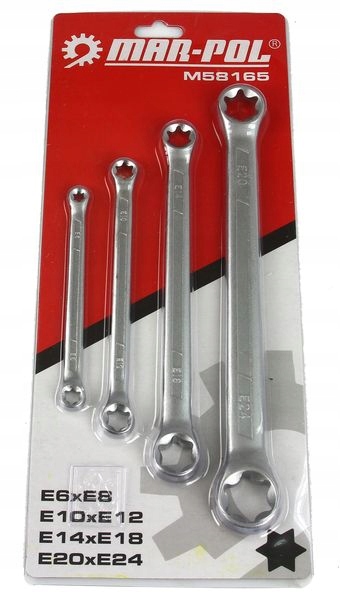 MAR-POL Klucze oczkowe Torx zestaw 4 szt. 6-24 mm Klucze oczkowe TORX, zestaw 4 sztuk, rozmiar 6 - 24 mm, wykonane ze stali CrV, gwarantującej długą żywotność i niezawodność. Klucze z powłoką antypoślizgową. Niezawodne klucze torx oczkowe. Zestaw zawiera klucze:Klucze oczkowe Torx zestaw 4szt 6-24mm M58165