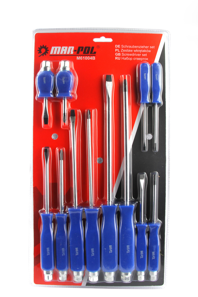 Zestaw profesjonalnych wkrętaków przeznaczony do podbijania, sprawdzi się w rękach zawodowca i amatora. Każdy wkrętak zakończony jest specjalnie wzmocnioną metalową skuwką do podbijania. Jej sześciokątny kształt pozwala na wygodne i precyzyjne przytrzymanie wkrętaka przy pobijaniu, a klucz znacząco zwiększa siłę odkręcania. Zestaw wkrętaków ślusarskich 12 sztuk. Trzon przechodzący przez rękojeść, zakończony zabierakiem sześciokątnym do wspomagania kluczem. Przekrój rękojeści i trzonu sześciokątny. Końce magnetyczne. Materiał: CrV, końcówki dodatkowo utwardzane.》》》 WKRĘTAKI ŚRUBOKRĘTY ZESTAW WKRĘTAKÓW ŚRUBOKRĘTÓW DO PODBIJANIA 12szt. M61004B 《《《