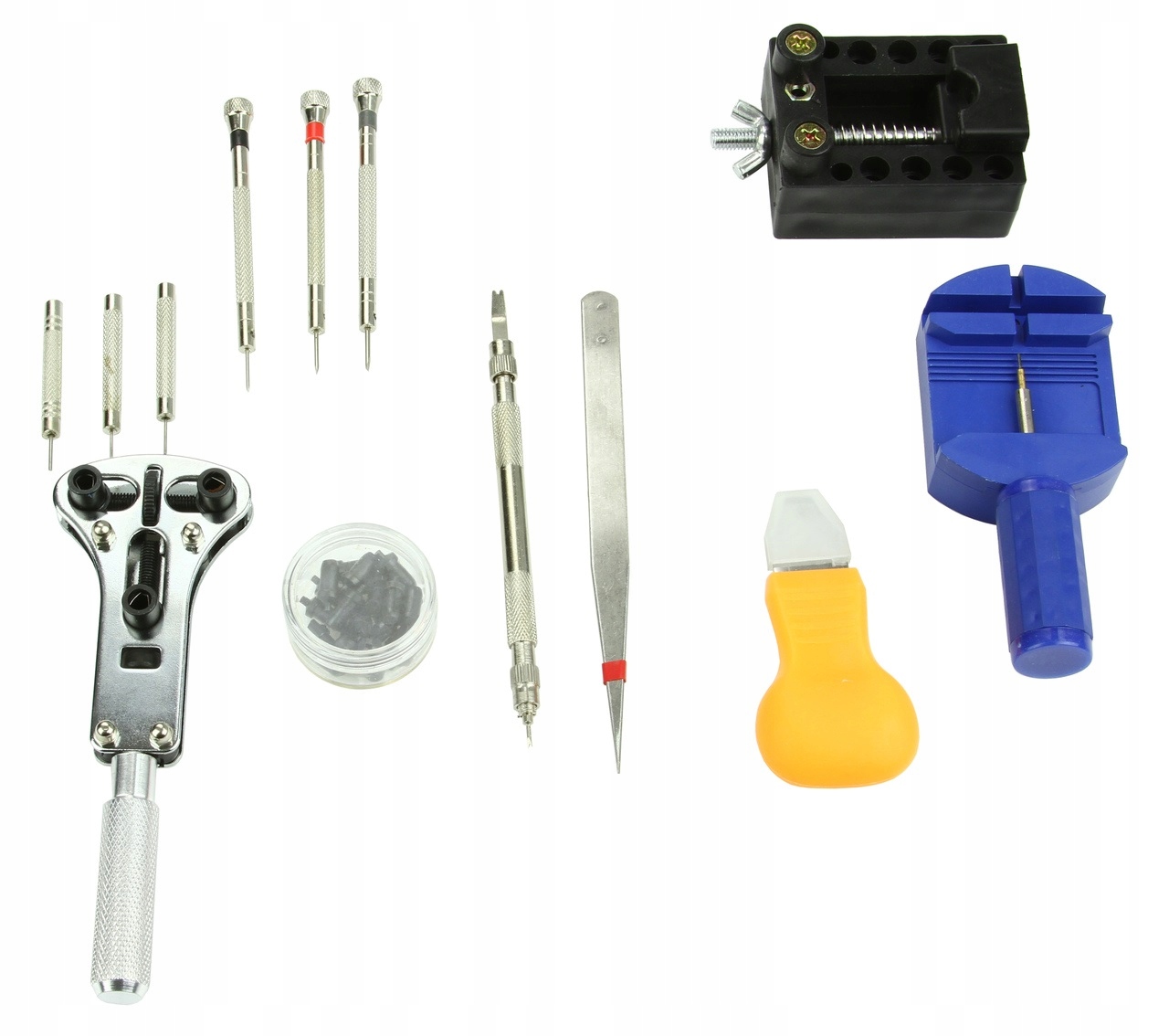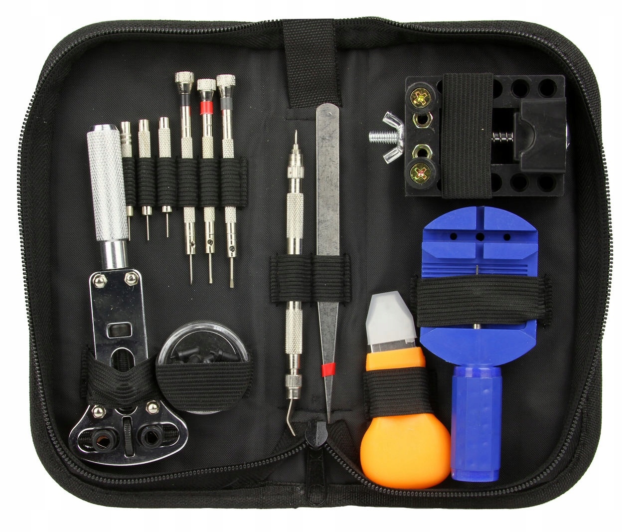 Zestaw narzędzi do amatorskich jak i profesjonalnych napraw różnego rodzaju biżuterii, elektroniki oraz drobnych rzeczy, które wymagają precyzyjnych narzędzi. Dzięki temu zestawowi z łatwością oraz precyzją w zaciszu domowych naprawisz swój ulubiony zegarek, który uległ uszkodzeniu. Zestaw ten zawiera dużą ilość elementów, dzięki któremu z łatwością wykonasz pełen serwis. Zestaw umieszczony został w poręcznym etui, ze specjalnymi gumkami, które umożliwią stabilne zapakowanie oraz pozostawią narzędzia w tym samym miejscu podczas transportu. Etui posiada zamek błyskawiczny, dzięki jesteśmy pewni że nie zgubimy żadnego z narzędzi. W zestawie znajduje się klucz do otwierania dekielków, kopert, pokrywek zegarków. Klucz szczególnie sprawdza się przy zegarkach wodoszczelnych z przykręcanym spodem. Regulowany w zakresie od Ø17 do 35 mm. W zestawie znajdują się 4 zestawy uchwytów, przystosowanych do większości zegarków. Dzięki temu zestawowi, samodzielnie naprawisz swój zegarek, biżuterię czy mniejszą elektronikę wymagającą precyzji, dzięki czemu zaoszczędzisz czas oraz pieniądze. Zestaw posiada narzędzia do rozmontowania zegarka oraz do jego późniejszego zmontowania. DANE TECHNICZNE: