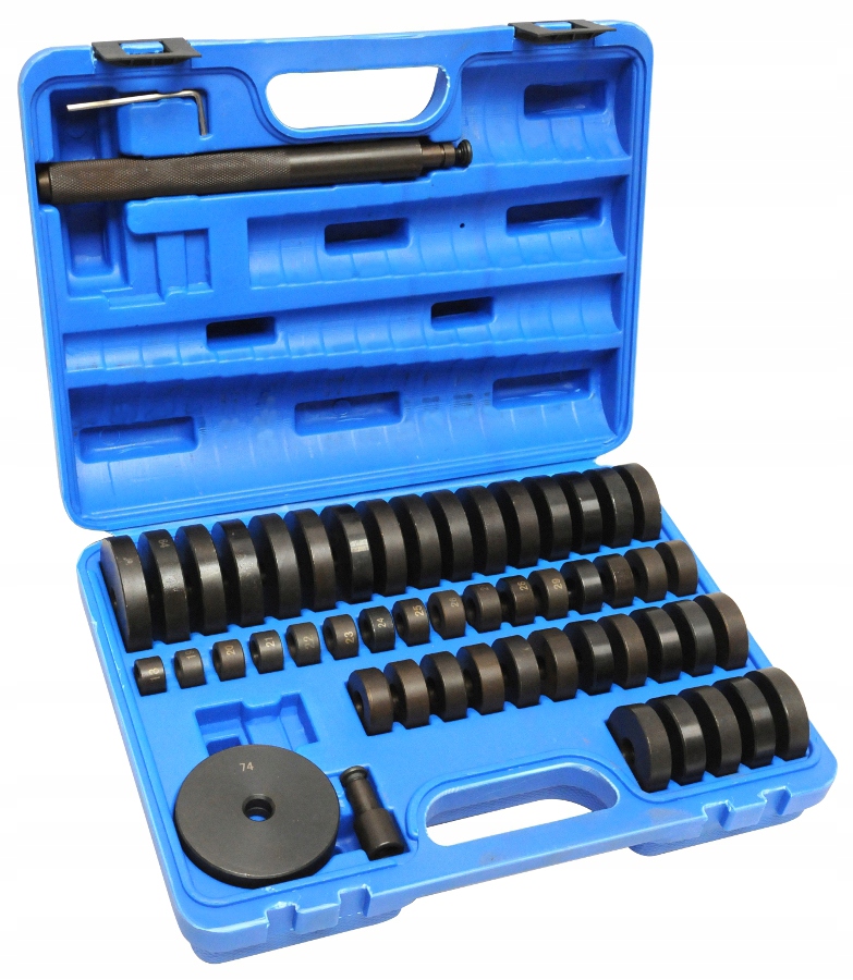 Zestaw narzędzi do montażu i demontażu łożysk oraz tulei metalowo gumowych oraz sworzni. Zestaw może służyć również jako adaptery do pras hydraulicznych przy wyciskaniu łożysk, tulejek i sworzni. W zestawie znajduje się 49 sztuk adapterów. ✅ W ZESTAWIE: