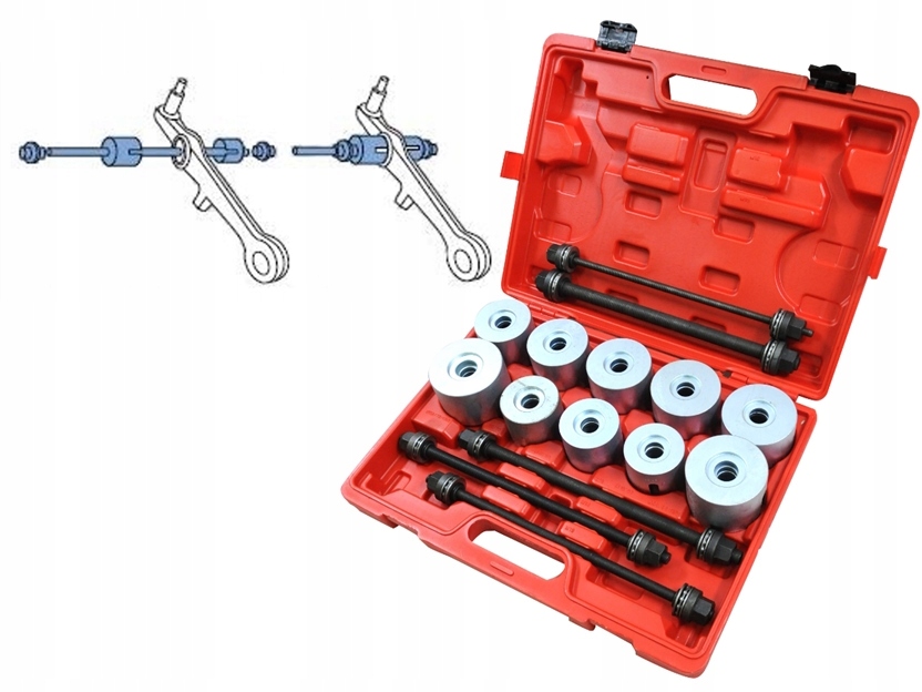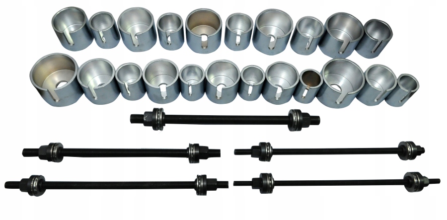 Uniwersalny ściągacz do większości samochodów i małych autobusów. Idealny do demontażu tulei, łożysk i uszczelniaczy. Zestaw zawiera 22 szt. tulei i 5 szt.gwintowanych wrzecion W ZESTAWIE: