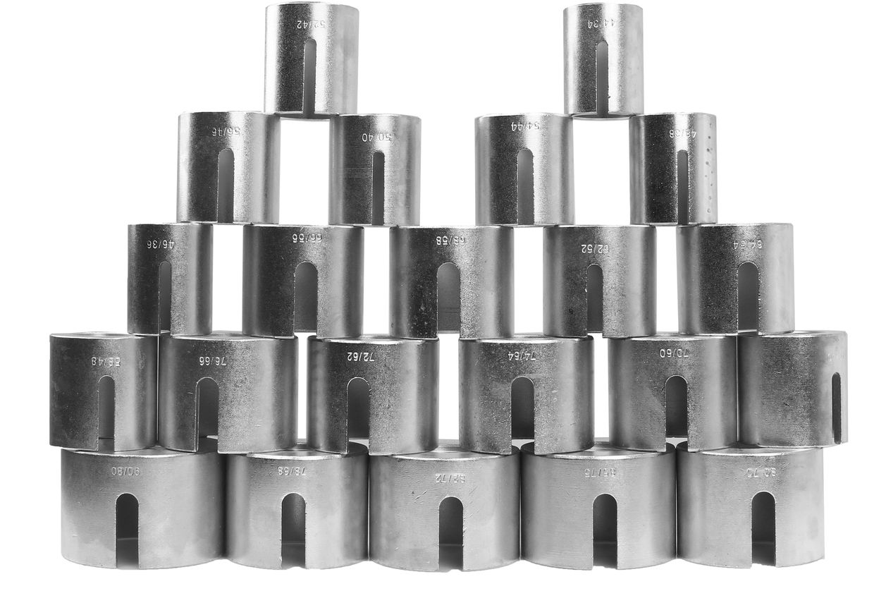 Uniwersalny ściągacz do większości samochodów i małych autobusów. Idealny do demontażu tulei, łożysk i uszczelniaczy. 5 Pras śrubowych gwintowanych z łożyskami kulkowymi na końcach: Adaptery o wysokości zewnętrznej 60 mm i 65 mm oraz średnicy zewnętrznej x wewnętrznej kolejno:
