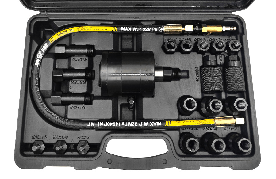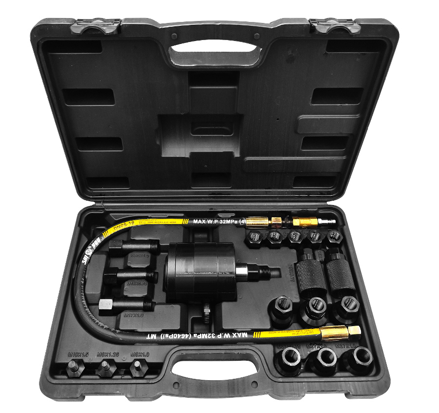 Pneumatyczny ściągacz do wtryskiwaczy to specjalistyczne narzędzie wykorzystywane w warsztatach samochodowych do demontażu wtryskiwaczy paliwa z silnika. Wtryskiwacze są kluczowymi komponentami w nowoczesnych systemach paliwowych, odpowiedzialnymi za precyzyjne dostarczanie paliwa do komór spalania. Ze względu na ich ścisłe dopasowanie i narażenie na działanie wysokich temperatur i ciśnień, wtryskiwacze mogą być trudne do usunięcia bez odpowiedniego narzędzia. Ściągacz wykorzystuje siłę pneumatyczną do generowania odpowiedniego ciśnienia, które bezpiecznie i skutecznie wydobywa wtryskiwacz z głowicy silnika. Zestaw zawiera różnorodne końcówki i adaptery, dzięki czemu może być używany z szeroką gamą wtryskiwaczy różnych producentów (Bosch, Delphi, Denso, Siemens) i modeli pojazdów. Jest to narzędzie przeznaczone do pracy w trudnych warunkach warsztatowych, umożliwiające mechanikom oszczędność czasu i zwiększenie efektywności pracy przy jednoczesnym zmniejszeniu ryzyka uszkodzenia drogich komponentów silnika ✅ Parametry techniczne :