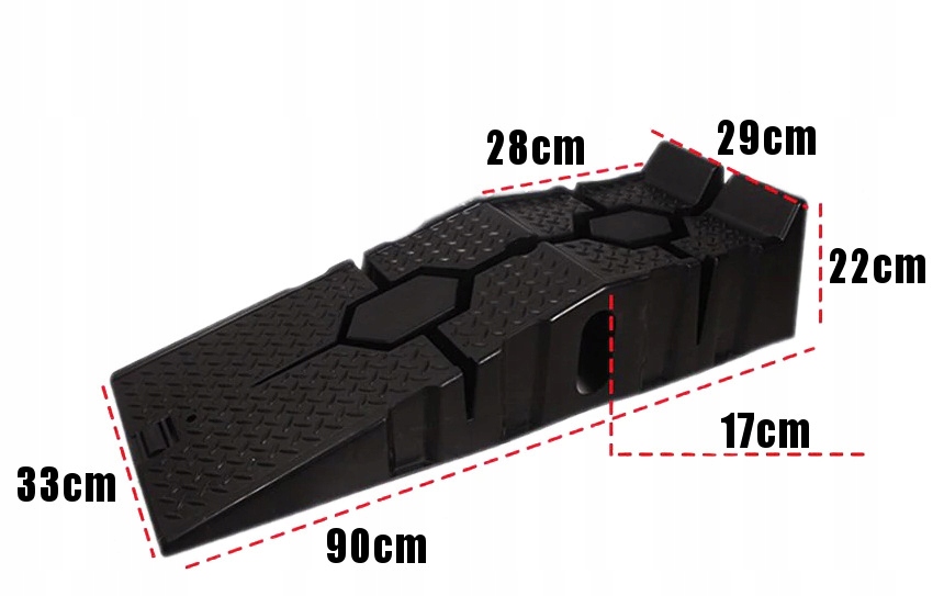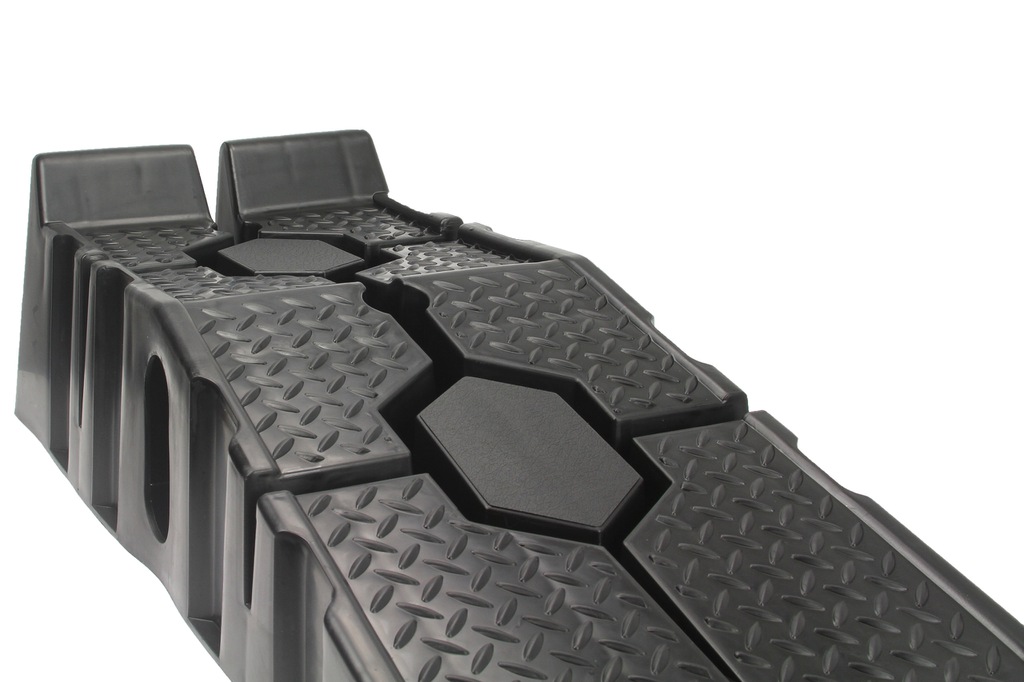 Uniwersalne rampy podjazdowe do samochodów osobowych, idealnie sprawdzą się w przydomowych garażach. Duża wysokość maksymalna, łagodny kąt podjazdu. Specjalna guma antypoślizgowa Każda z ramp posiada pod spodem specjalną gumową nakładkę, która zapobiega przesuwaniu się rampy na śliskim podłożu. Żłobienia materiałowe i wysoki próg bezpieczeństwa Rampy są wyposażone w wysoki próg zabezpieczający auto przed stoczeniem się do przodu. Dodatkowo całość rampy pokryta jest specjalną strukturą zwiększając przyczepność. Łatwe przechowywanie Rampy mają specjalnie zaprojektowane podstawy, które umożliwiają nałożenie jednej rampy na drugą co znacznie zmniejsza miejsce, które jest potrzebne do przechowywania ramp.