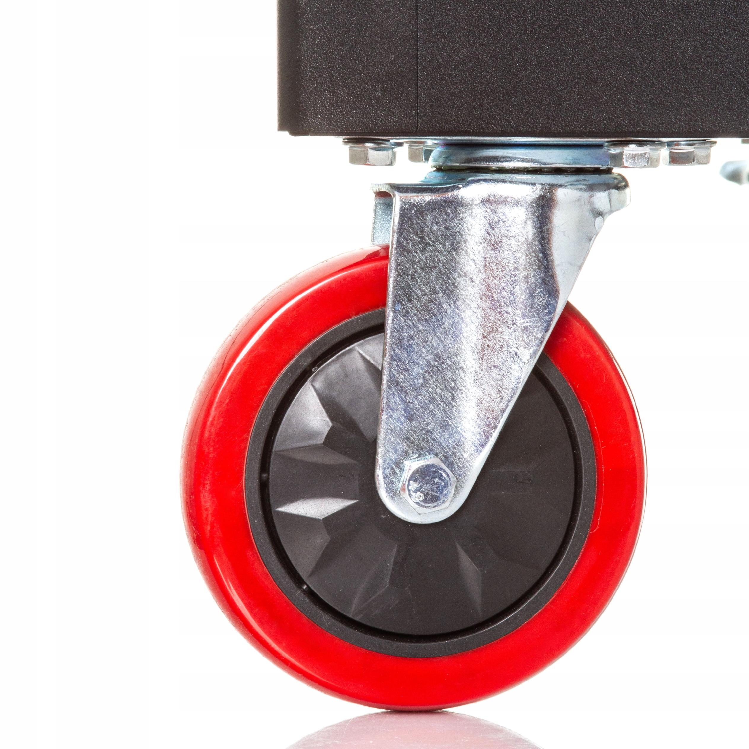 Wózek posiada podwójne ścianki, blokadę szuflad i 4 mobilne kółka, co ułatwia transport. Dodatkowo narożniki odbojniki chronią przed przypadkowym uszkodzeniem np. karoserii.